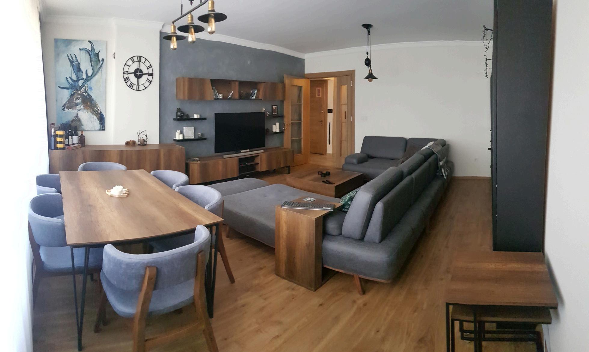 A limited color palette of black, wood, and gray was maintained, with an Italian-style faux concrete finish applied to the TV wall for contrast. Even small details were addressed, such as replacing a dark wooden curtain rail with a sleek white plasterboard cover. Through these changes, the outdated apartment was transformed into a contemporary, well-lit space that harmoniously balances materials, colors, and functionality, bridging the gap between past and present aesthetics.