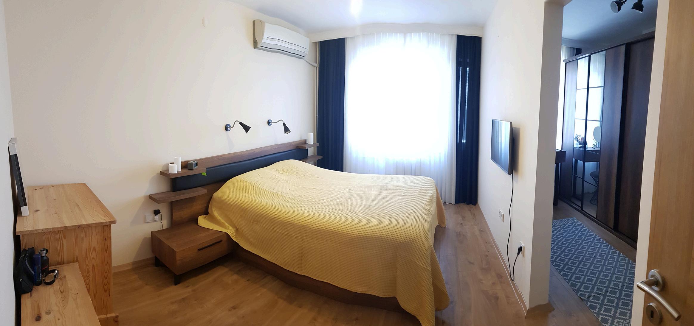 The original bedroom was cramped for a double bed and wardrobe To address this, we removed the dividing wall between the adjacent room, transforming it into a spacious walk-in closet. This alteration not only expanded the circulation space but also increased the room ' s overall sense of openness and the influx of natural light.