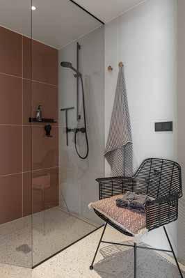 Санузлы впечатляют уже отделкой в соответствии с пакетом – стена приятного терракотового оттенка с модной напольной плиткой террацо и качественной мебелью, а также некоторы-