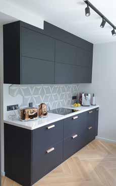 oluline oli köögimööbel, sest on ju köök kodu süda, kus kas kahekesi, pere või sõpruskonnaga maailma maitseid nautida. Kuigi köögi pind polnud suur, leidis sisearhitekt nutikad lahendused, kuidas luua maksimaalne köögi töötasapind, peenelt ruumi sulanduvad panipaigad ja peeglite abil visuaalne ühendus elutoa ning külalistega. Samamoodi on korteri seinu ja mööblit ühendava stilistikaga muudetud nurgaga köögimööbel, söögiala, elutuba ja trepikäik üheks tervikuks, et kõik pereliikmed ning külalised saaksid alati võrdselt toimuvast osa.