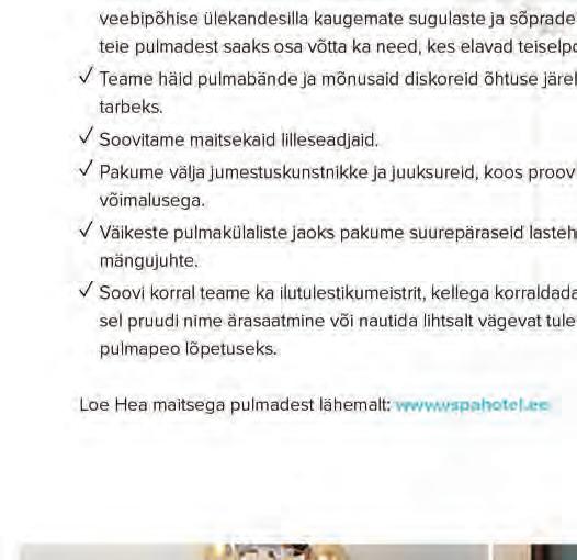 Et pulmapidu ja -ööd maksimaalselt nautida, soovitan hoida fookus sellel, miks üldse pulmi peetakse. See peaks olema ju armastuse pühitsemise pidu, kus teie kaks olete kõige tähtsamad. Unustage ära soov külalistele muljet avaldada. Pidage teineteist prioriteediks, olge olemas ennekõike oma kallima jaoks. Tehke terve peo vältel teineteisele kauneid komplimente, vaadake silma, flirtige. Näen liiga tihti, kuidas külaliste nimel pingutatakse väga, aga teineteist unustatakse ära. Palun pange asjad tähtsuse järjekorda ja kui ikka olete abiellunud armastuse pärast, siis... Suudelge ka niisama, ilma et külalised peaks "Kibe!" hüüdma. See pidu on teie pulmaöö eelmäng.