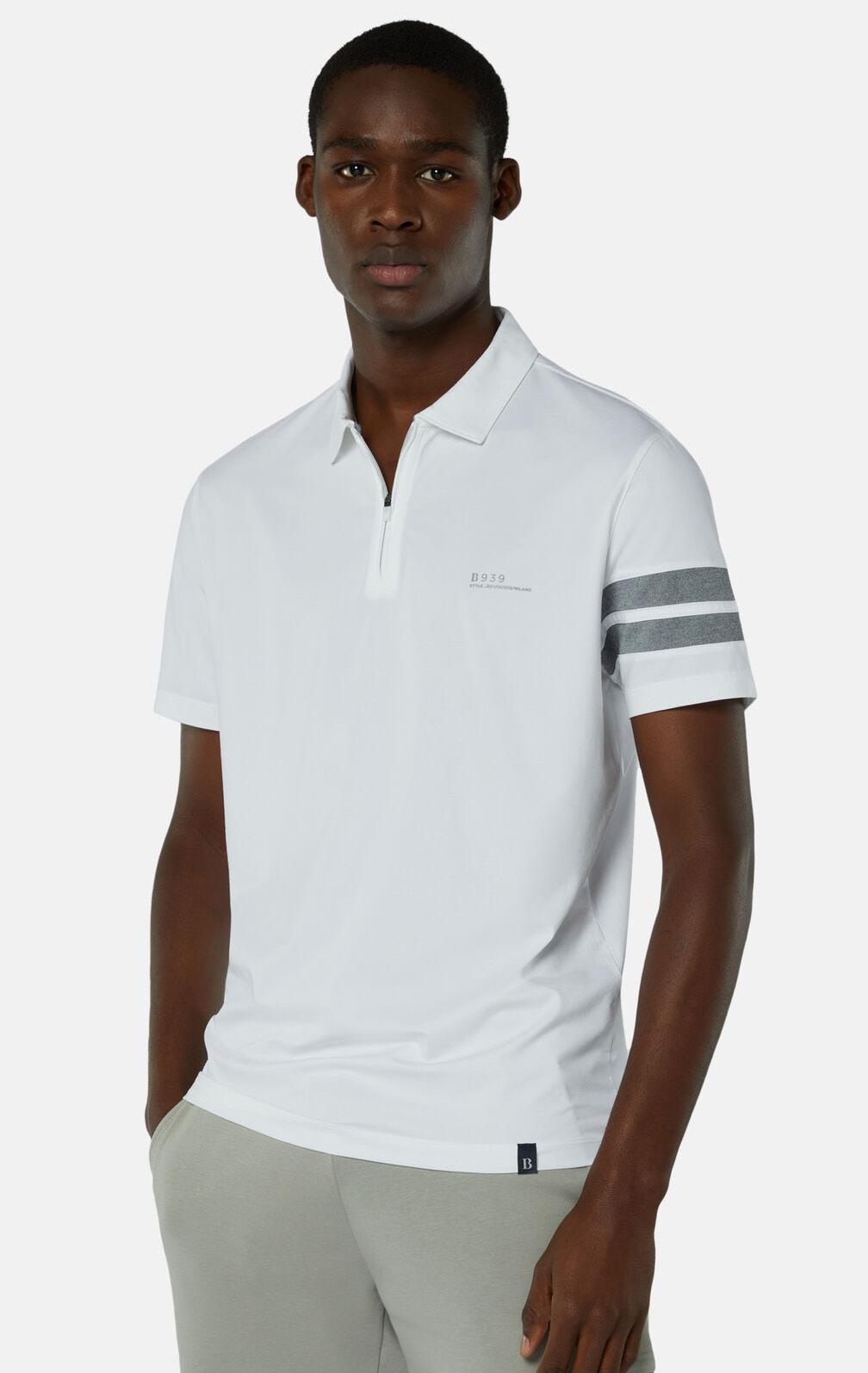Polo con cuello bowling. Confeccionado con en punto japonés de algodón y poliéster. La composición y la particular estructura del tejido garantizan una alta resistencia a las arrugas, máxima comodidad, elevada transpirabilidad y fácil cuidado.