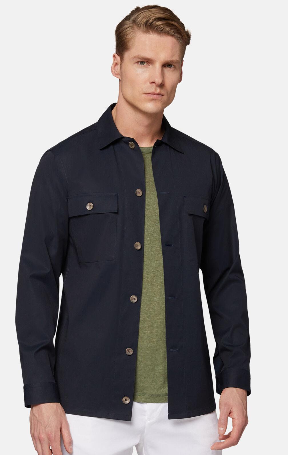 Sobre camisa con cuello abierto confeccionada en algodón puro y Tencel elástico. Los botones están grabados con el logo.