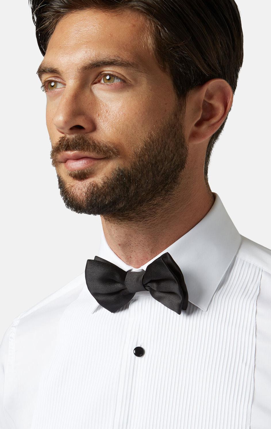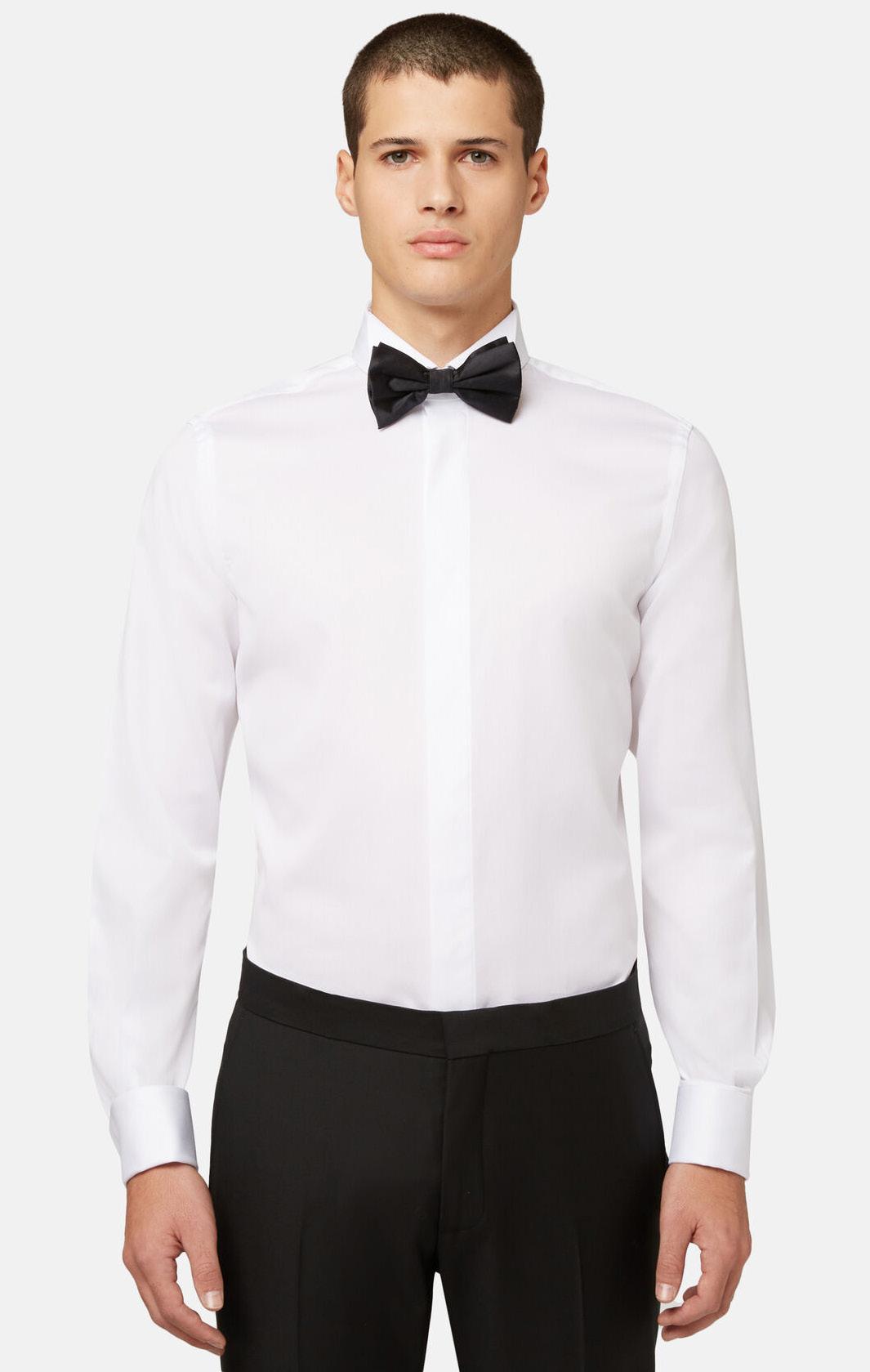 Camisa de cuello diplomático para smoking fabricada con algodón de doble torsión se caracteriza por el detalle de la botonadura delantera oculta.