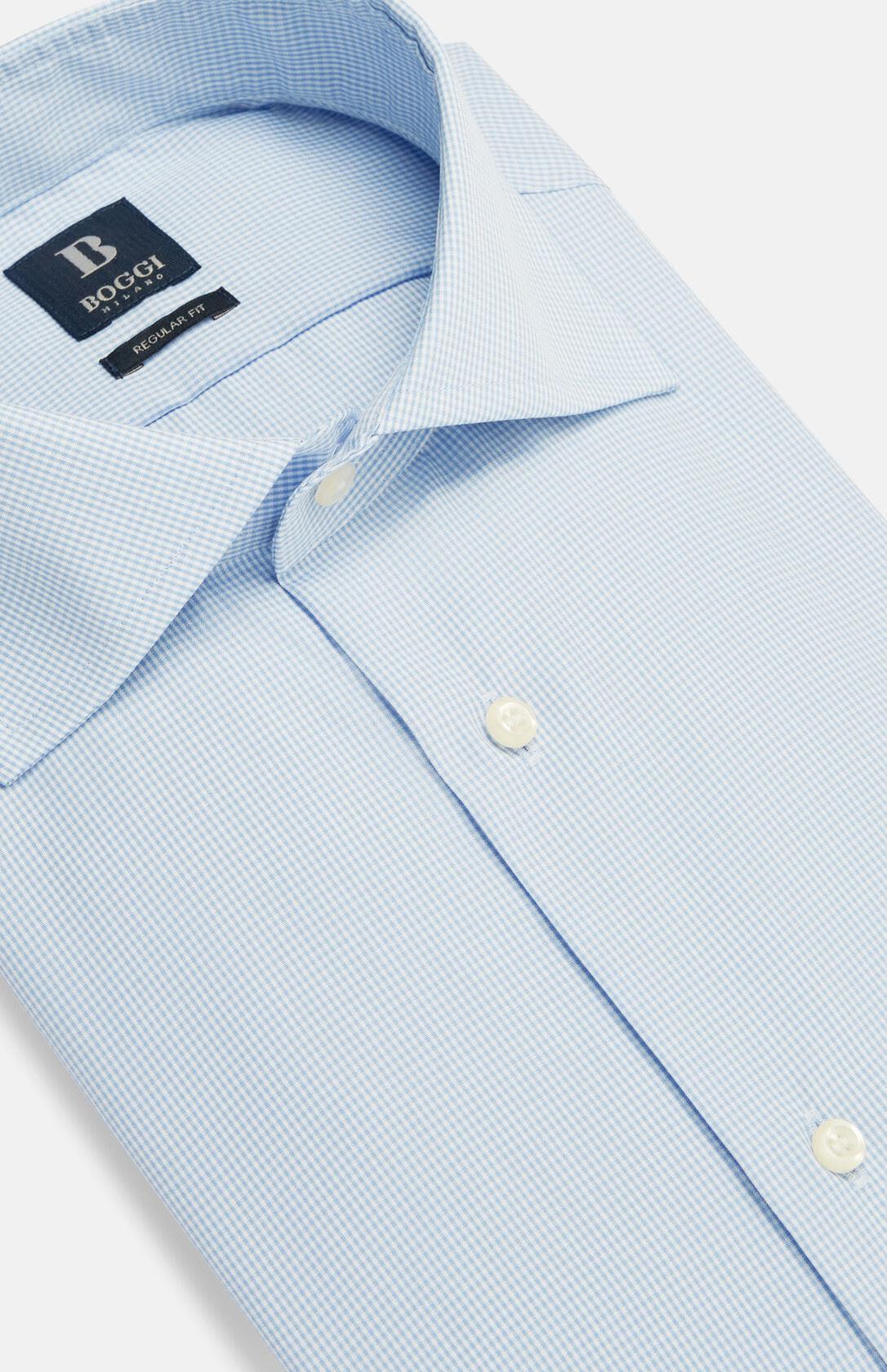 Camisa con cuello Windsor, ultimate non-iron. El tejido es un dobby de algodón de doble torsión. La particular confección y el acabado al que se somete la prenda garantizan resistencia a las arrugas y un cuidado extremadamente fácil.