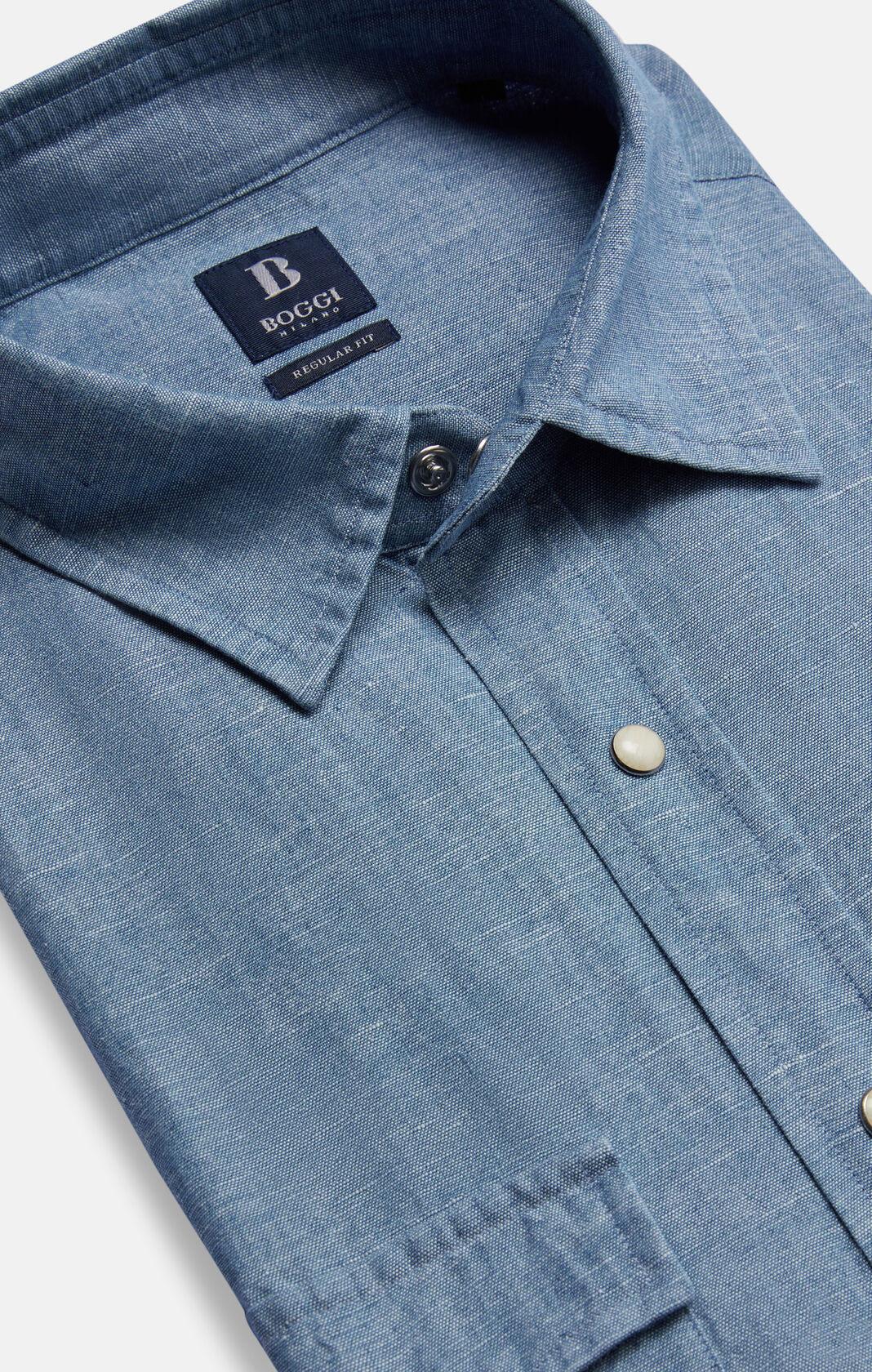 Camisa con cuello cerrado. Confeccionada en denim de algodón y lino, presenta cierre con botones de presión. El color puede variar ligeramente con cada lavado.