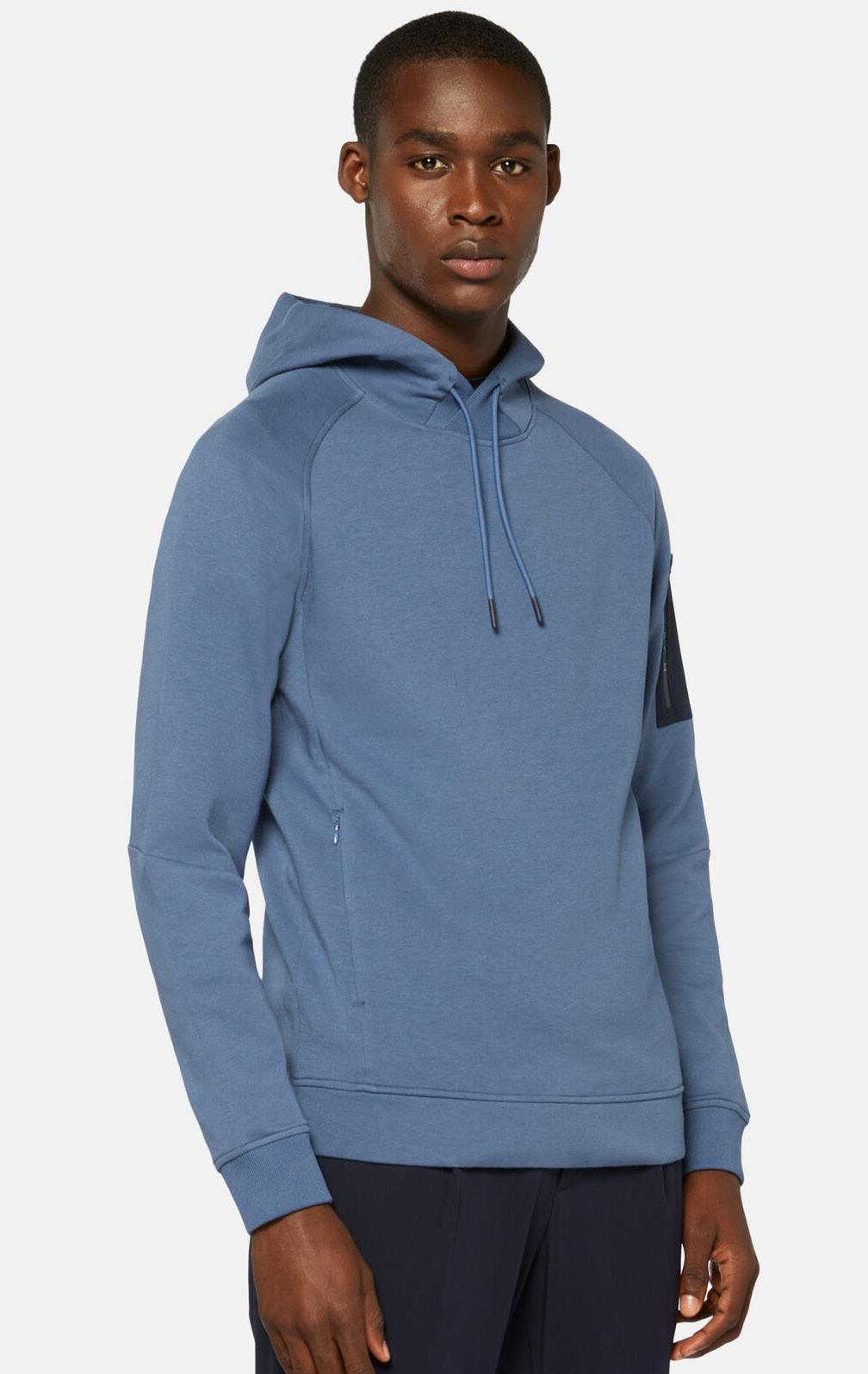 Sudadera con capucha de la línea B-Tech, caracterizada por sus tejidos de vanguardia. El punto jersey light, que combina algodón y poliéster elástico reciclado, garantiza un alto rendimiento en términos de elasticidad y comodidad.