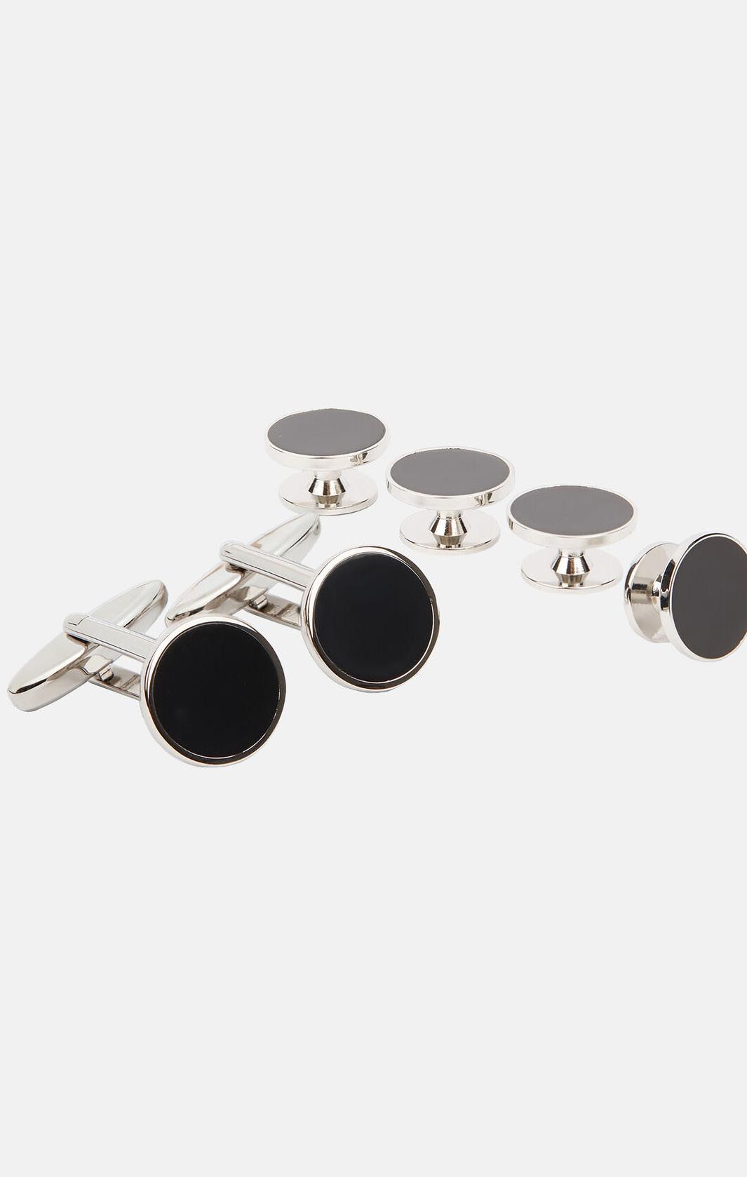 Gemelos de forma circular modelo tuxedo. Hechos de metal plateado con centro negro.