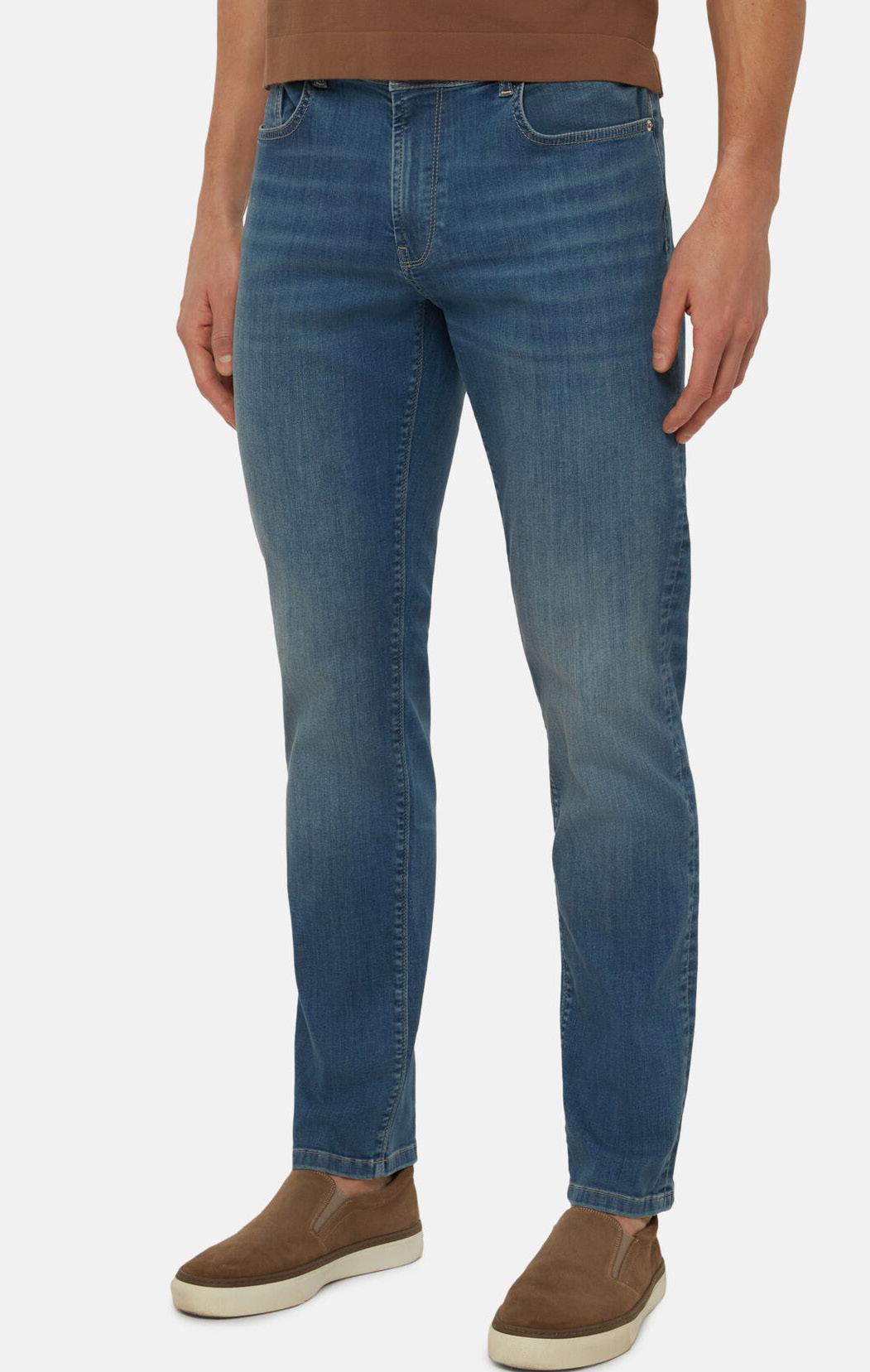 Pantalón jean de denim de algodón elástico. Lavado medio.