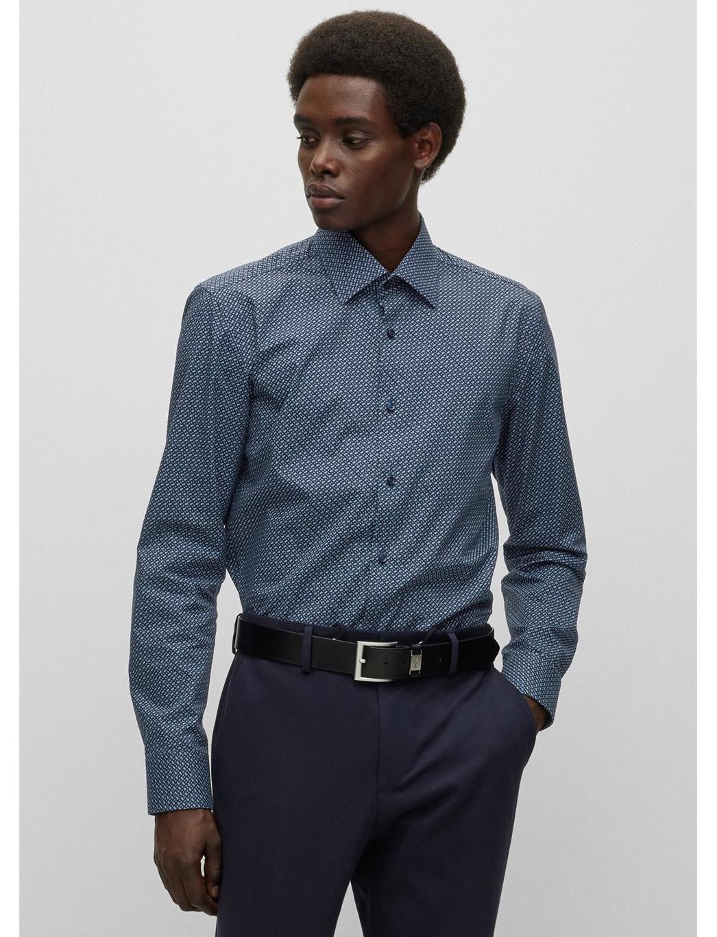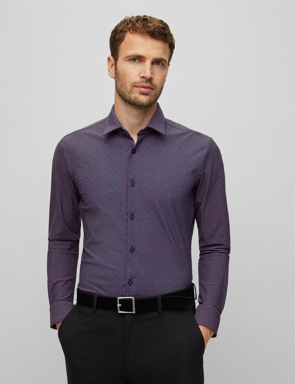 Una camisa versátil con un estampado exclusivo. Esta camisa de manga larga y corte slim fit está elaborada en punto elástico técnico que garantiza una libertad de movimiento total. Una cinta adorna el interior del cuello modelo Kent.