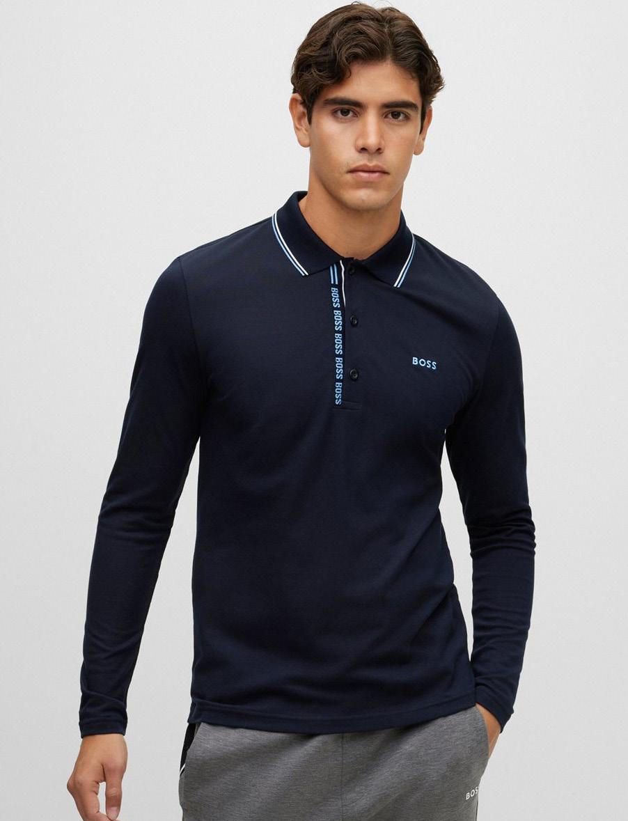 Una camisa elaborada en punto de piqué de puro algodón, esta camisa de manga larga tiene una cinta con el logo en el interior de la tapeta que le confiere un toque moderno. El logo de Boss aparece en contraste en la parte izquierda del pecho.