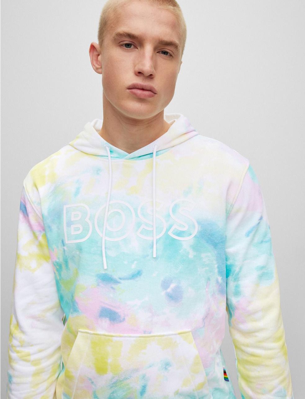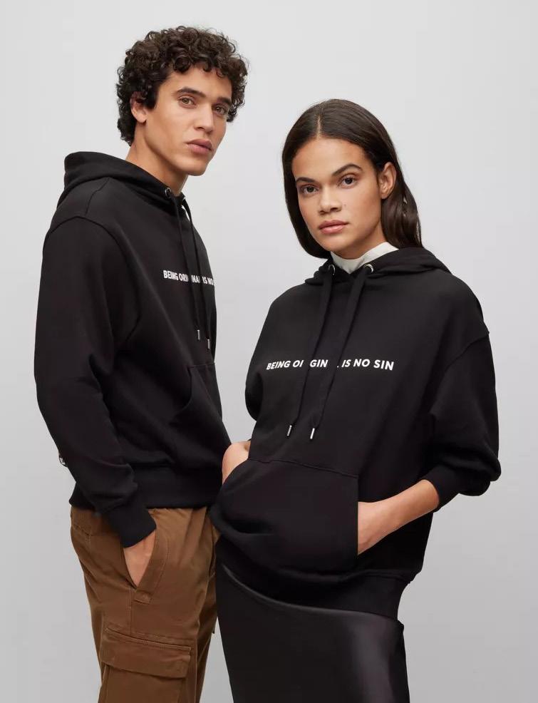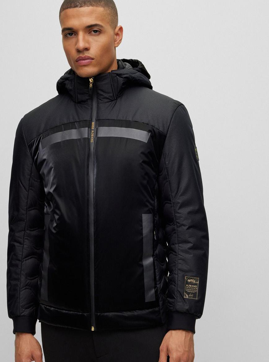 Una sudadera con capucha híbrida. El pecho izquierdo se detalla con un logotipo de Boss curvo. Este estilo es parte de una cápsula exclusiva creada por Boss en colaboración con el boxeador Anthony Joshua.