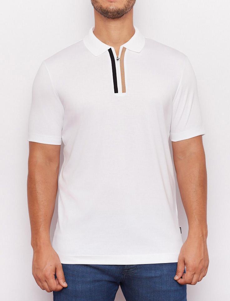 Un polo Boss de corte estrecho con rayas en contraste y logos en el cuello y la tapeta, este polo de manga corta se ha diseñado en piqué transpirable de puro algodón Oxford, el detalle de la marca incluido en la parte izquierda del pecho le añade el toque final.