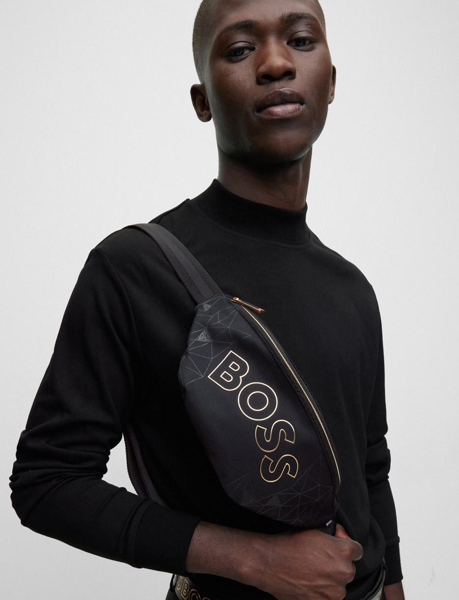 Un bolso modelo sobre de Boss. Este bolso compacto con cursores de cremallera a rayas de la marca está elaborado en tejido italiano, revestido con las iniciales de Boss estampadas por toda la superficie para lucir un look exclusivo. La correa ajustable incluye otros detalles de la marca.