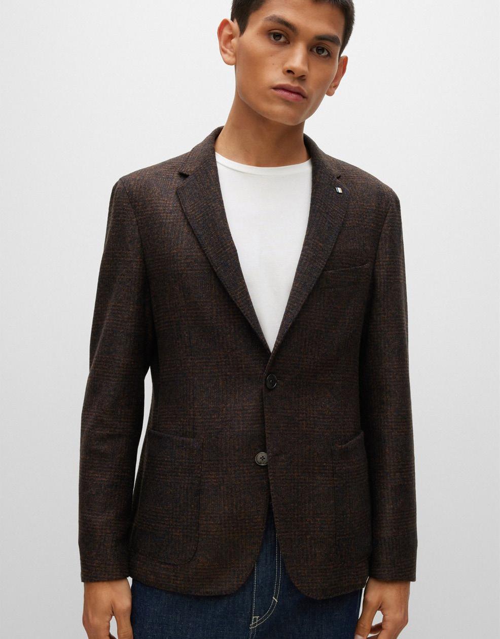 Elaborado en lana virgen con micro estampado, este moderno saco regular fit se presenta con un estilo moderno y de líneas impecables, la solapa viene rematada con un alfiler con una raya característica de Boss.