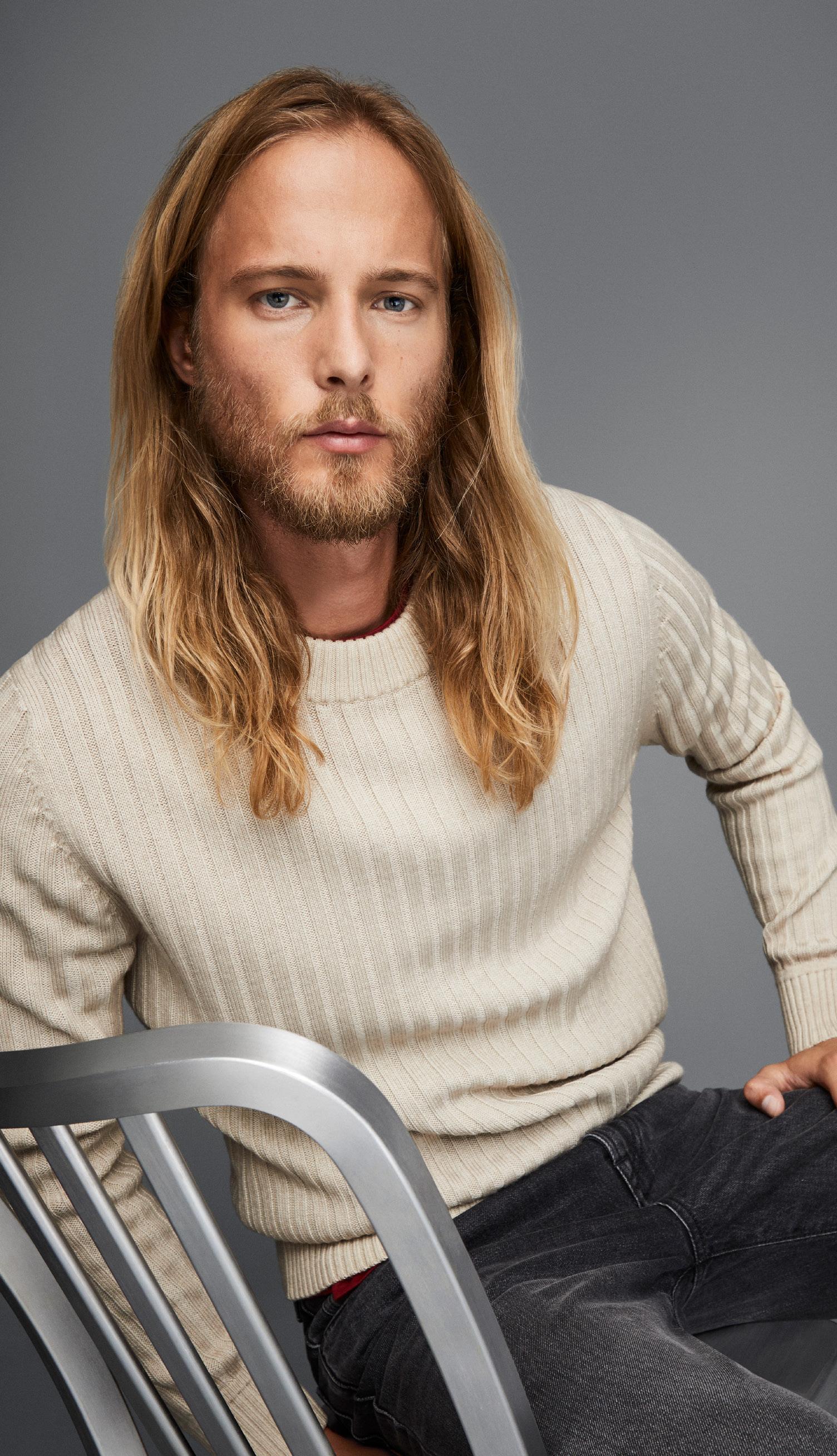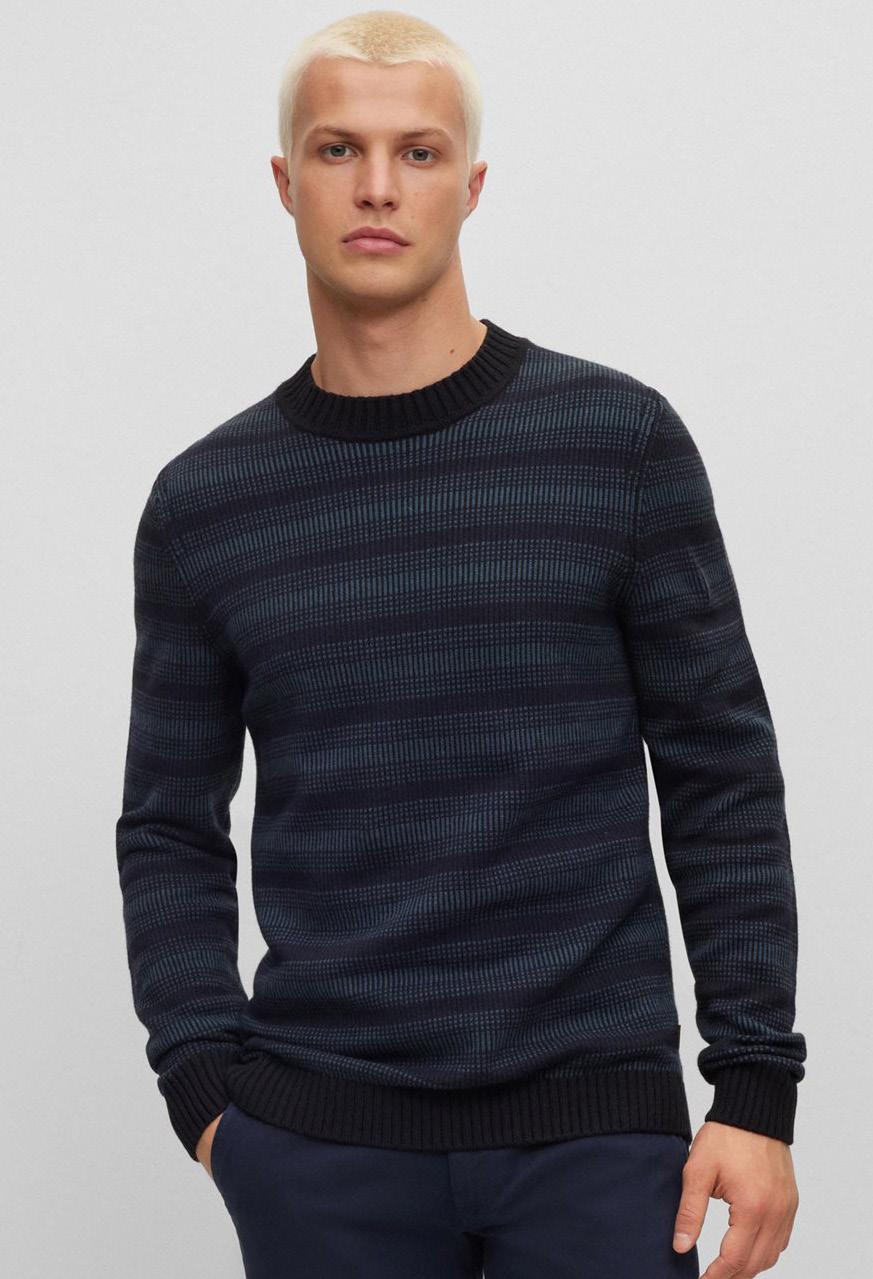 Una chompa relaxed fit diseñado con un estampado de rayas abstractas amplias que le confiere un look moderno.