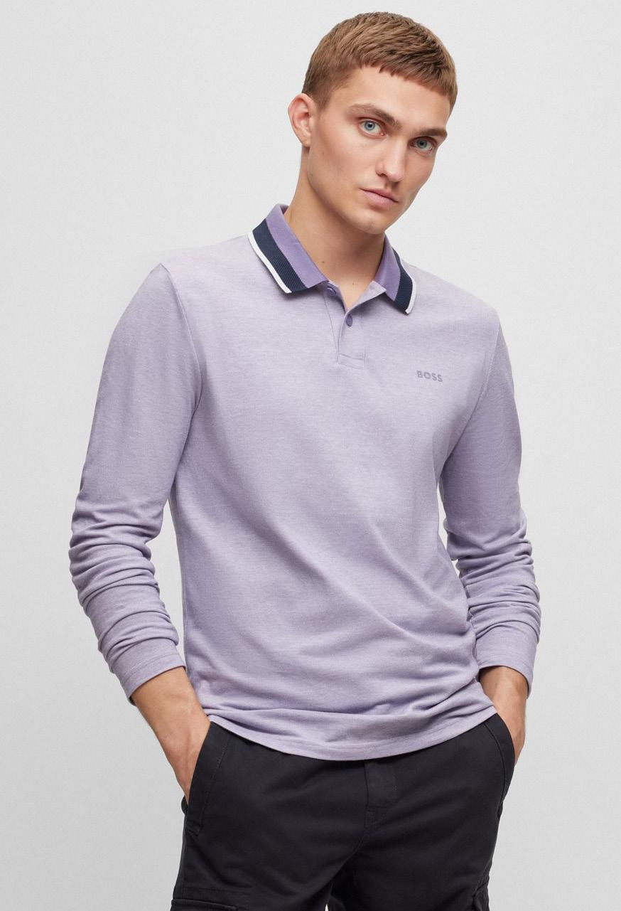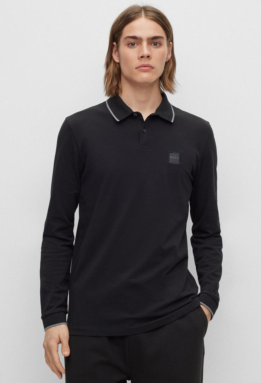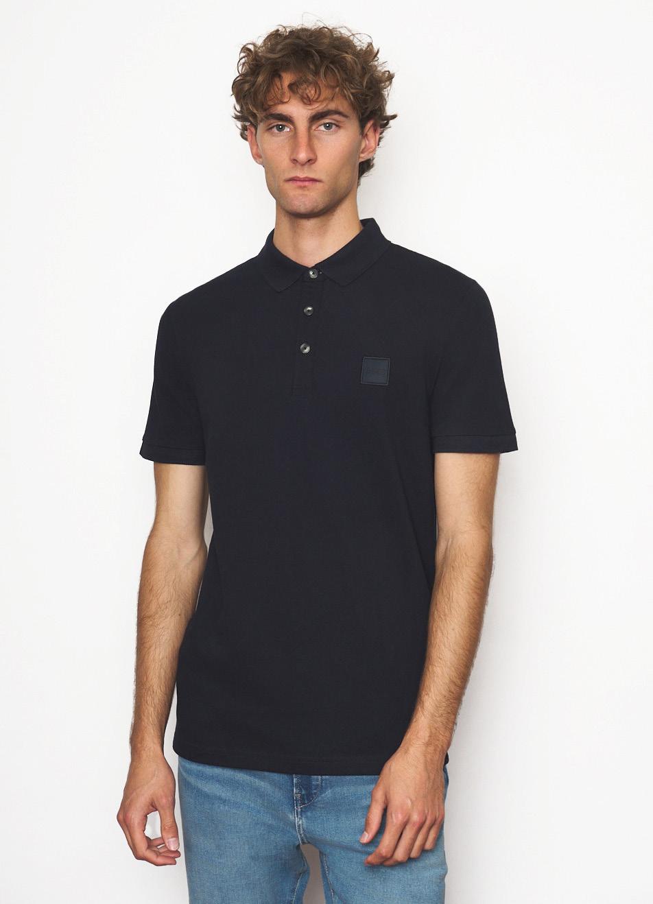 Un polo regular fit ribeteado en contraste en el cuello y los puños, está confeccionado en piqué elástico y adornado con un parche con el logo en un tono tonal. Para nuestros productos RESPONSABLES, siempre utilizamos al menos un 60% más de materias primas sostenibles.