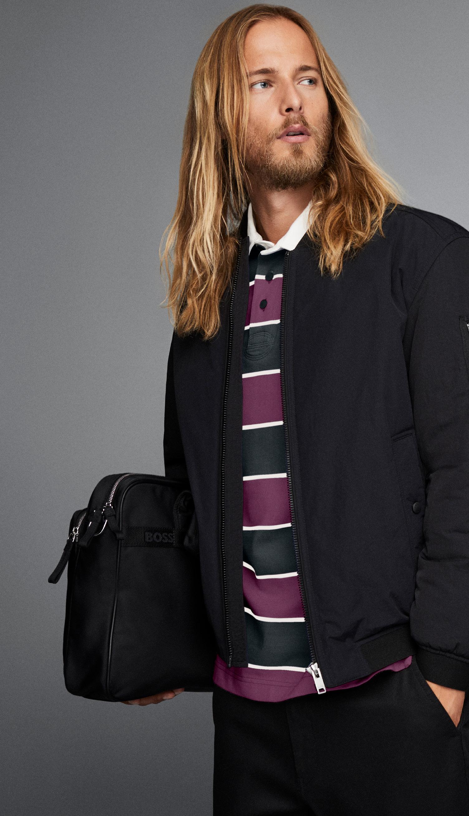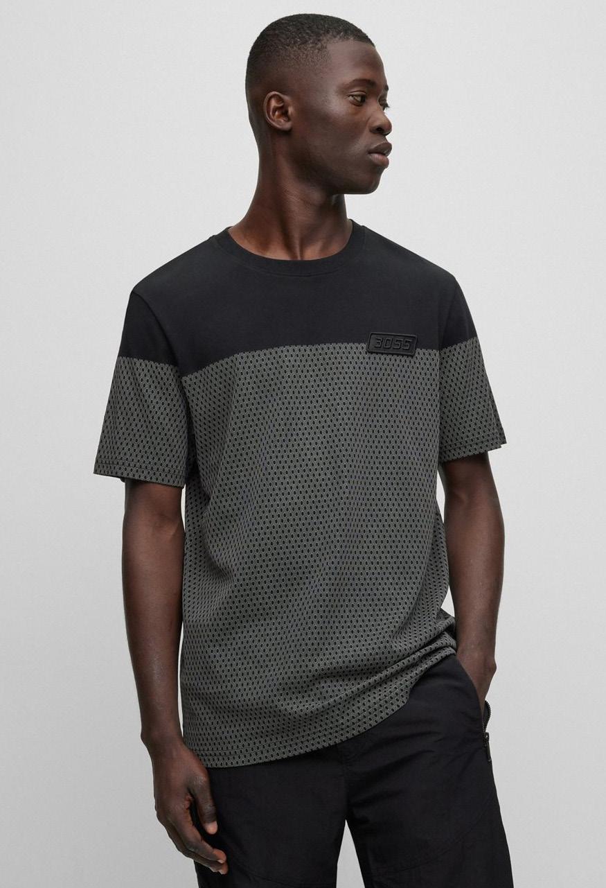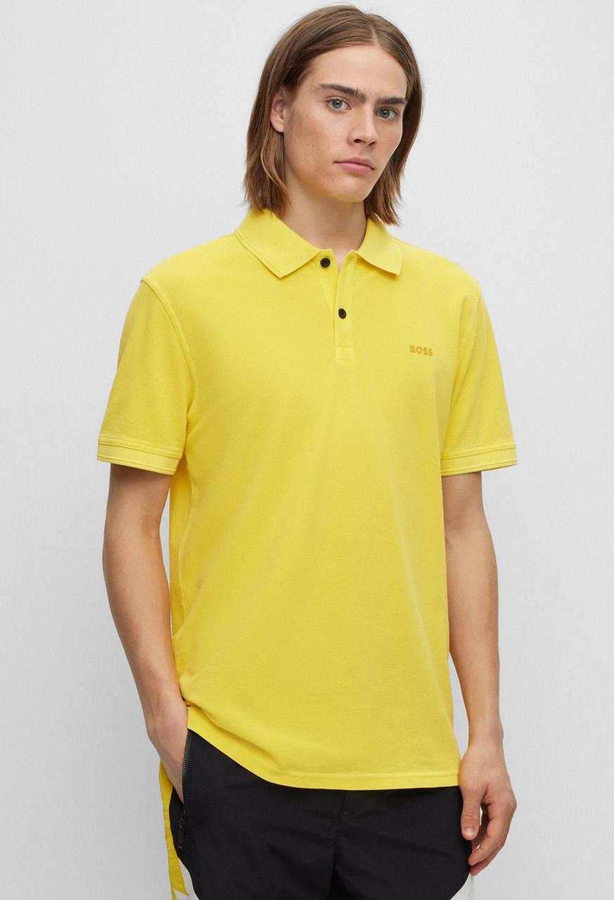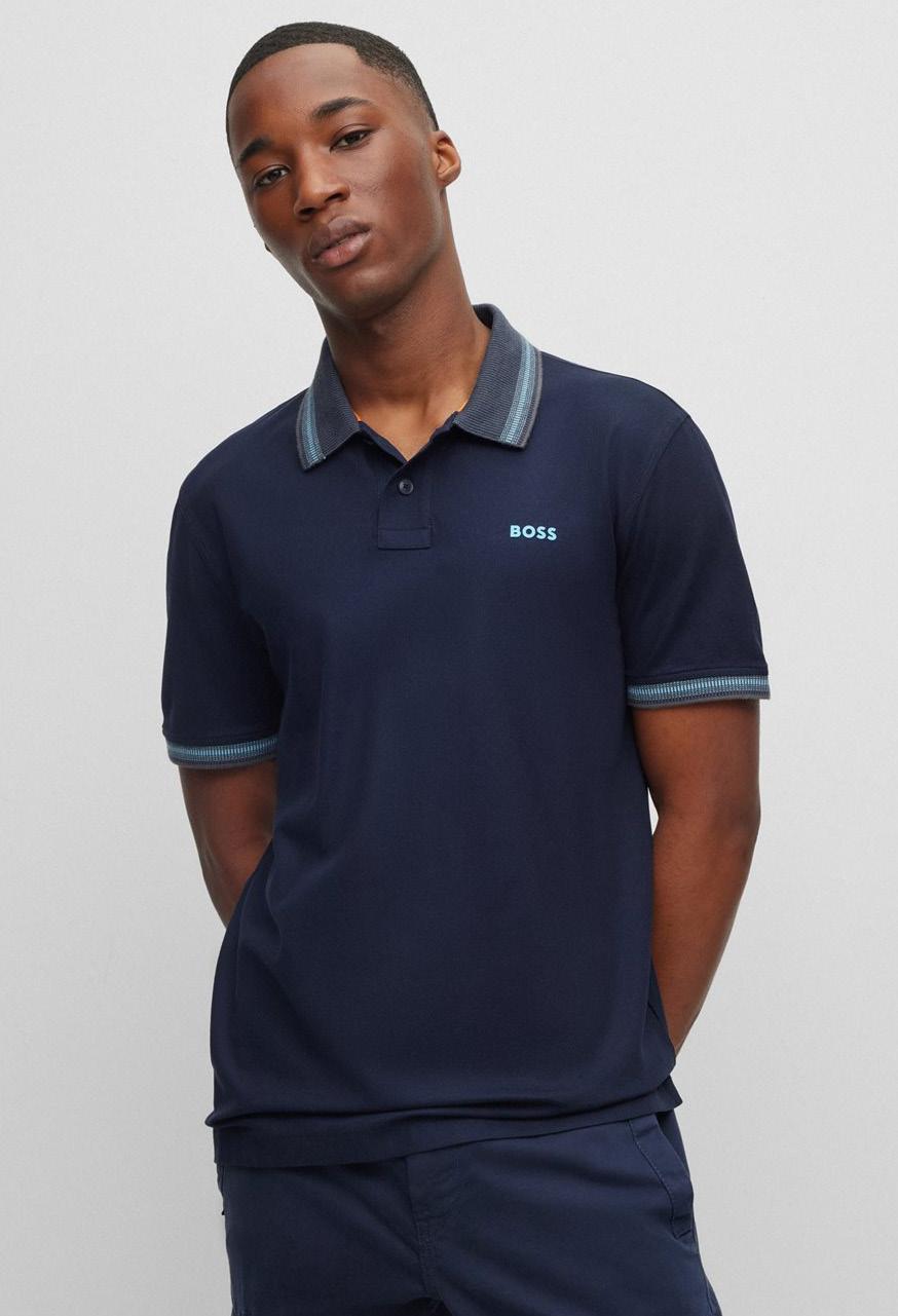 Un polo regular fit ribeteado en contraste en el cuello y los puños, está confeccionado en piqué elástico y adornado con un parche con el logo en un tono tonal. Para nuestros productos RESPONSABLES, siempre utilizamos al menos un 60% más de materias primas sostenibles.