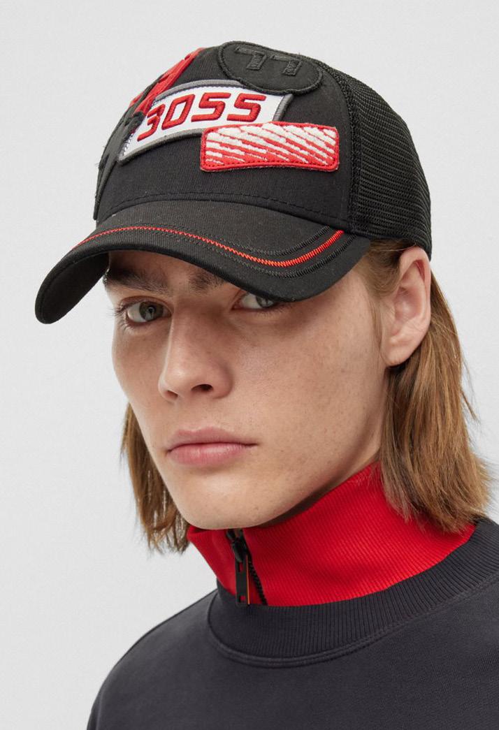 Una gorra de nueva temporada BOSS diseñada en sarga de algodón con paneles de malla, parches con logo inspirados en las carreras y detalles de costuras.