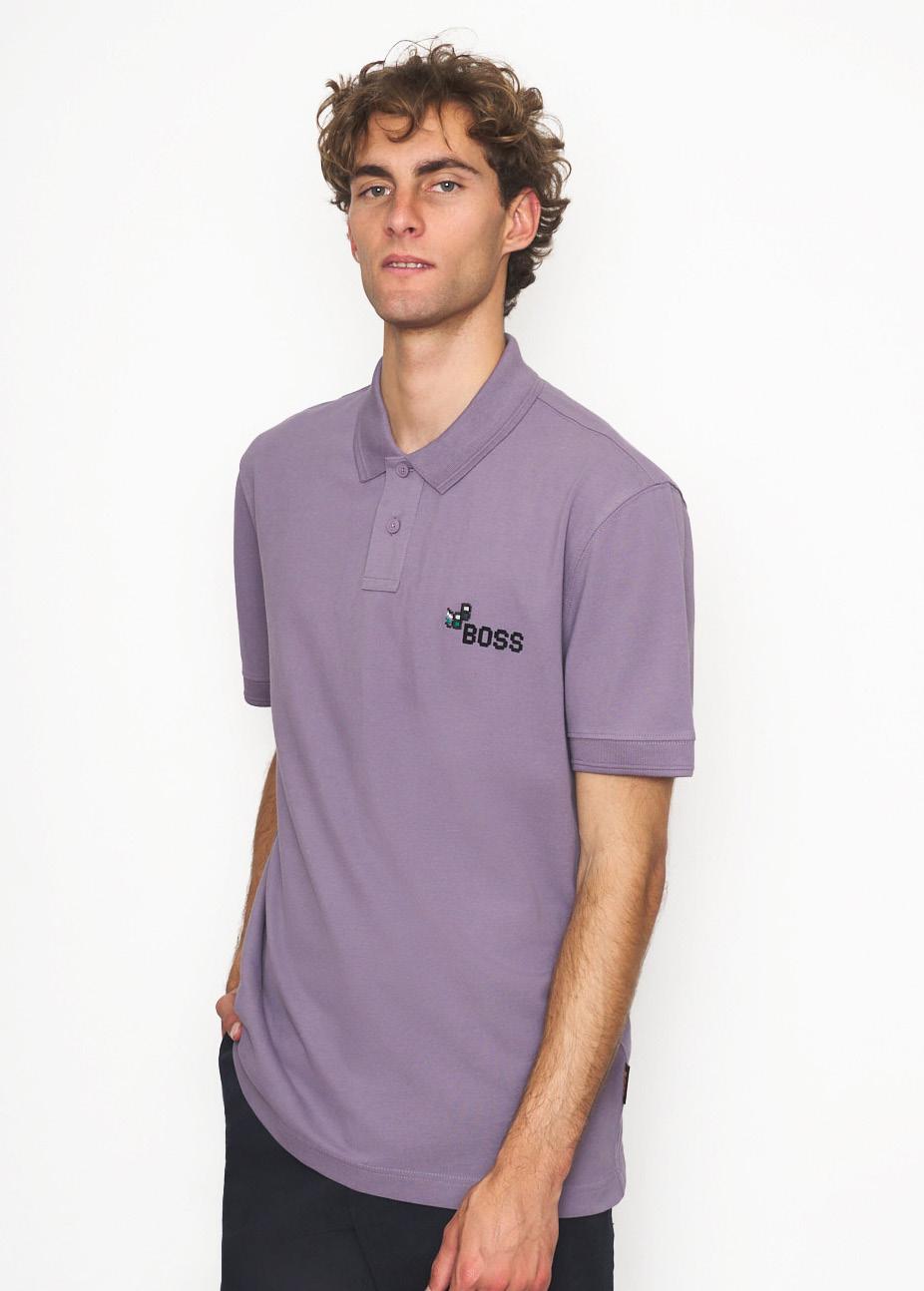 Polo de punto regular fit diseñado con un logo reflectante decorativo o con logos estampados en el pecho con diferentes técnicas.
