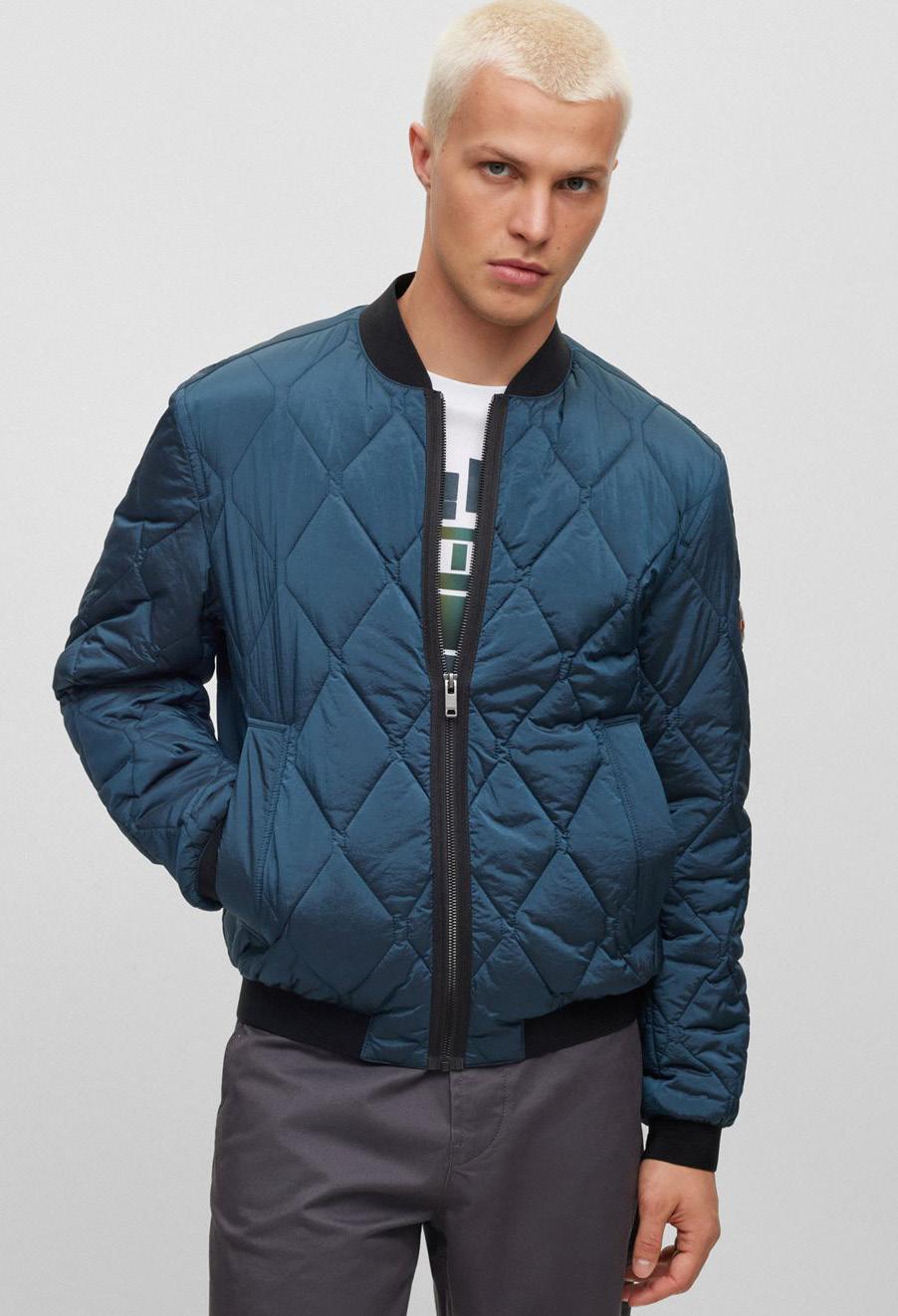 Casaca modelo Bomber con logo en material guateado de efecto metalizado.