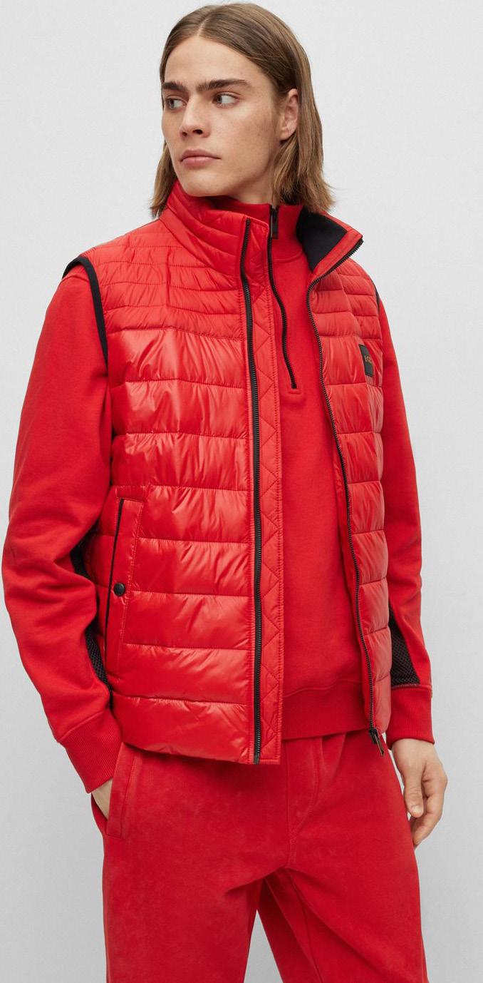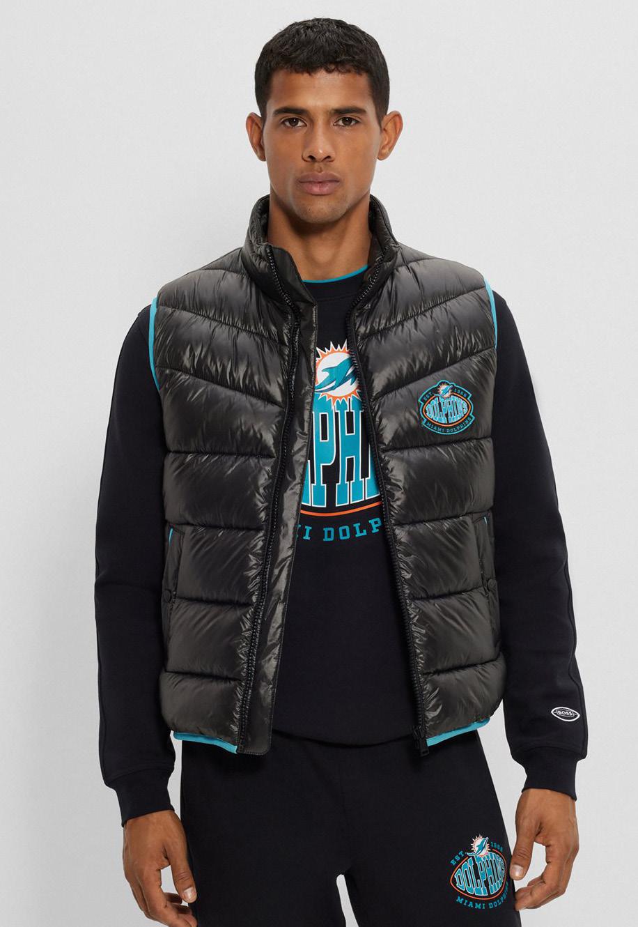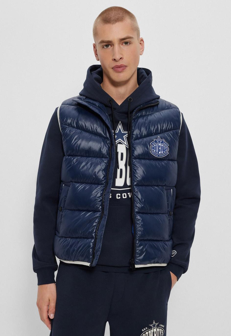 Chaleco acolchado repelente al agua BOSS x NFL con detalle de la colaboración.