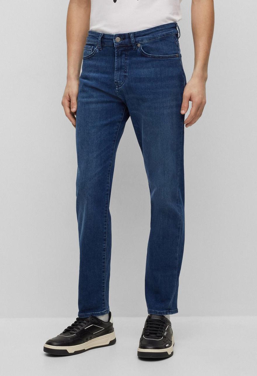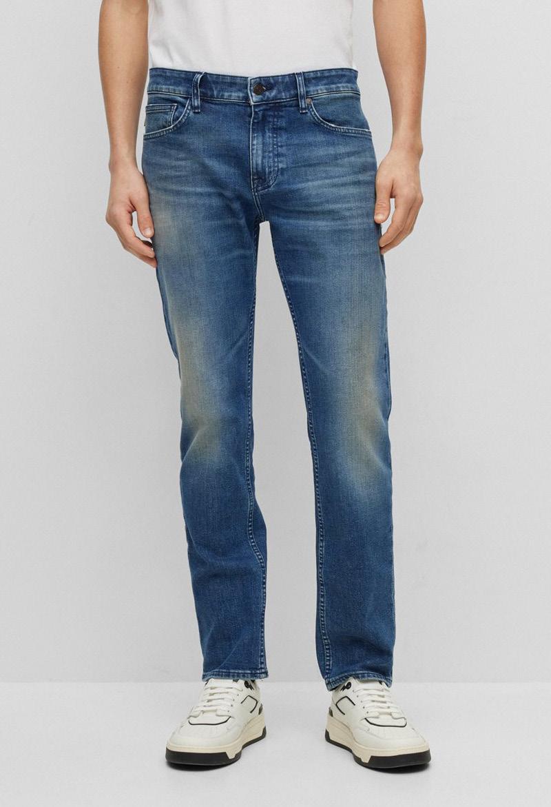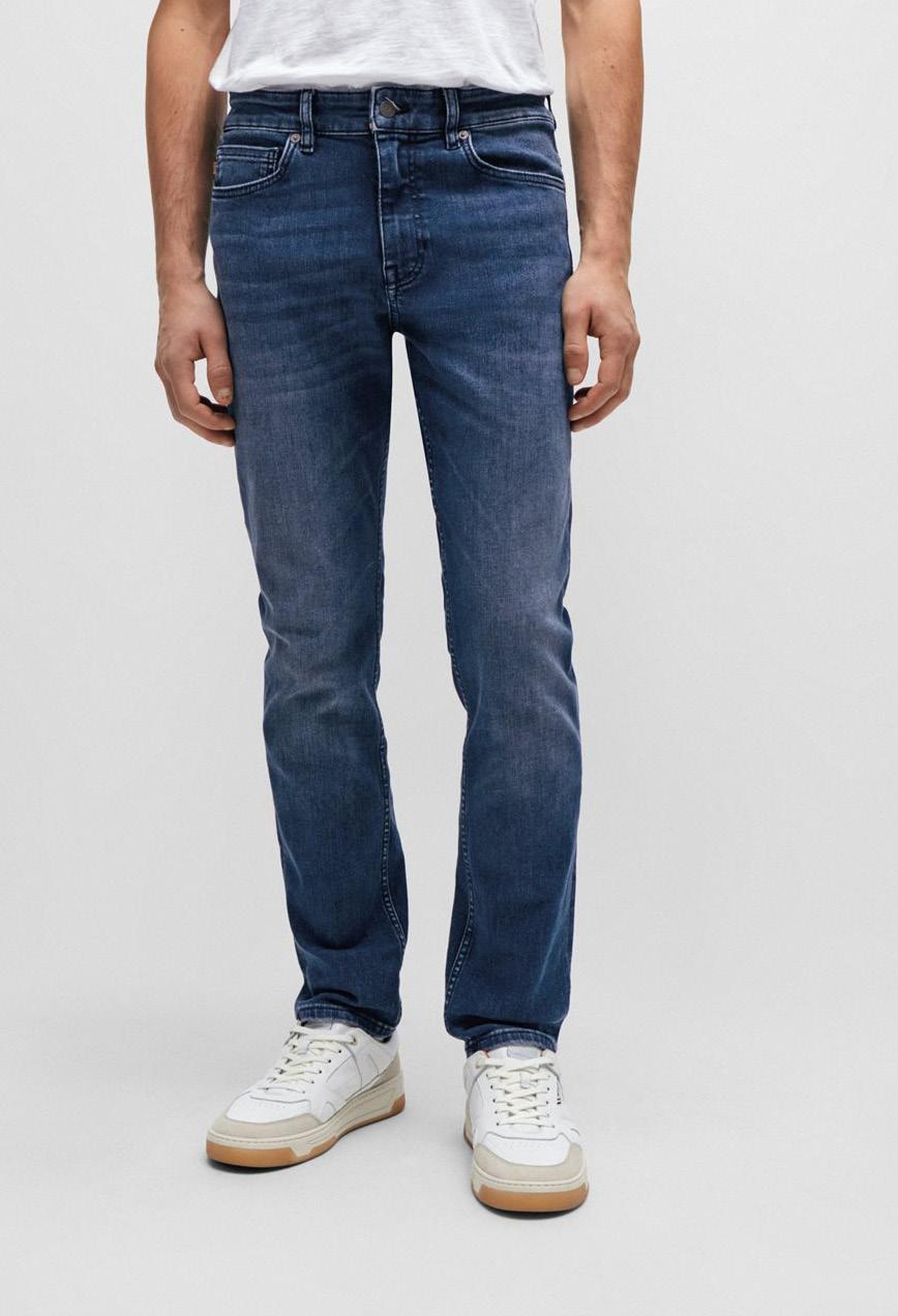 Pantalones Jean Slim fit y corte cónico en cómodo denim elástico azul con efectos de prenda usada.