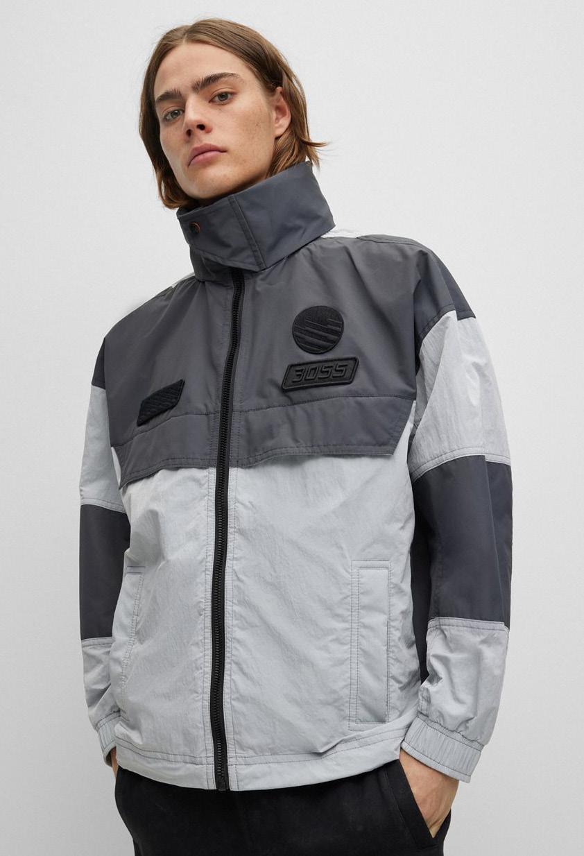 Casaca oversize fit con cremallera, confeccionada con un tejido antidesgarros repelente al agua y adornada con ribetes inspirados en las carreras de coches para lucir un estilo deportivo.