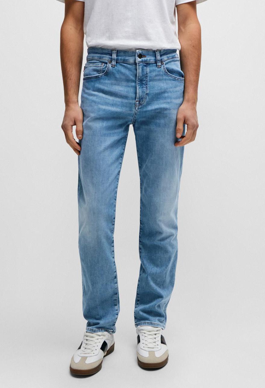 Unos pantalones jean azules con lavado desgastado moderno en cómodo denim elástico.