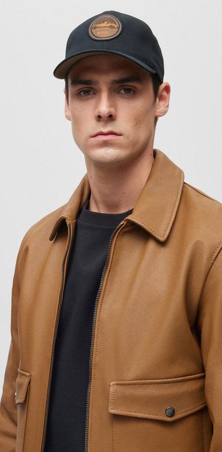 Casaca regular fit de piel lisa con el característico logotipo en un parche circular que representa un coche Porsche icónico. Esta prenda forma parte de la colección Porsche x BOSS, con detalles inspirados en las icónicas curvas de un coche deportivo de Porsche.