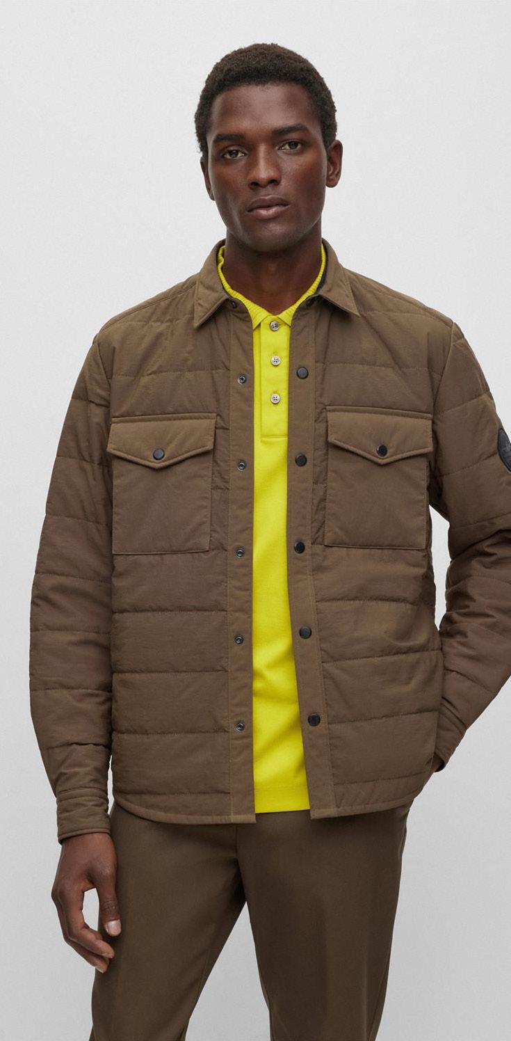Una camisa regular fit acolchada con ribetes lisos y parche con logo en la manga. Esta prenda forma parte de la colección Porsche x BOSS, con detalles inspirados en las icónicas curvas de un coche deportivo de Porsche.