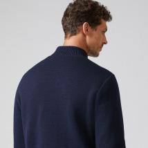 Chompa con cuello medio en una mezcla de lana de calibre 16 con cierre de cremallera, adornado con artesanía Jacquard de dos tonos y bandas contrastantes en puños, cuello y cintura.