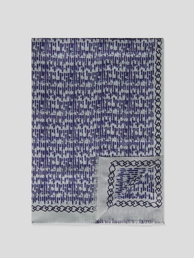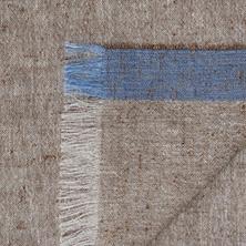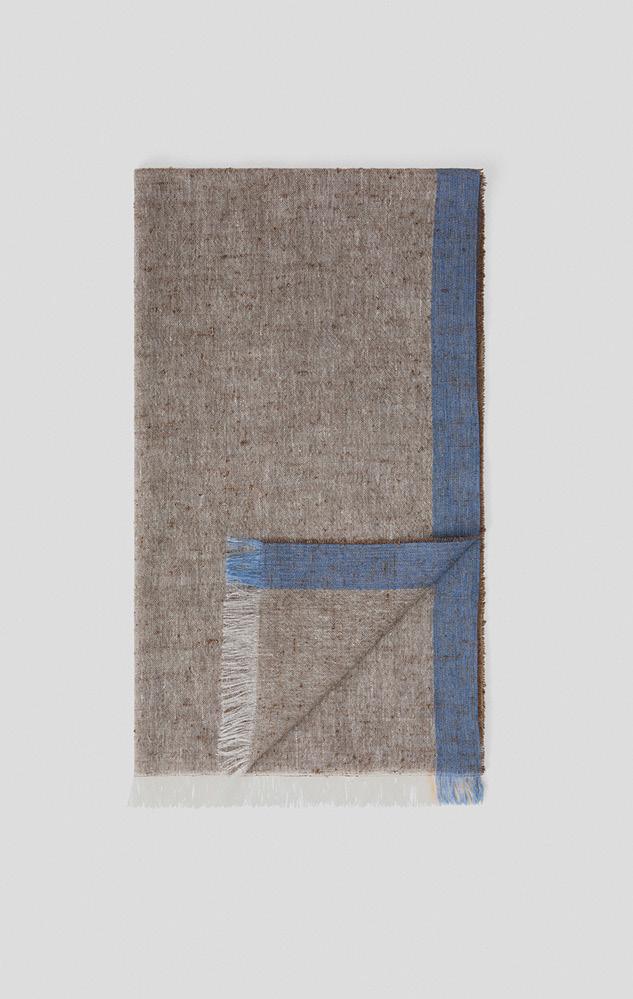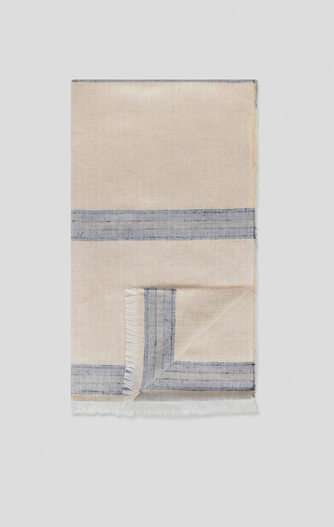 Bufanda en lino y seda, terminada por una pequeña franja con una banda en contraste en la parte inferior.