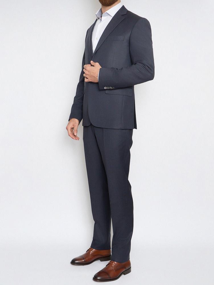 Traje de línea Vicenza en lana lisa, compuesta por un blazer de doble botón completamente forrado, con solapa de muesca y bolsillos de aleta, pantalones delanteros planos. Pantalones es de 19 cm de abajo.
