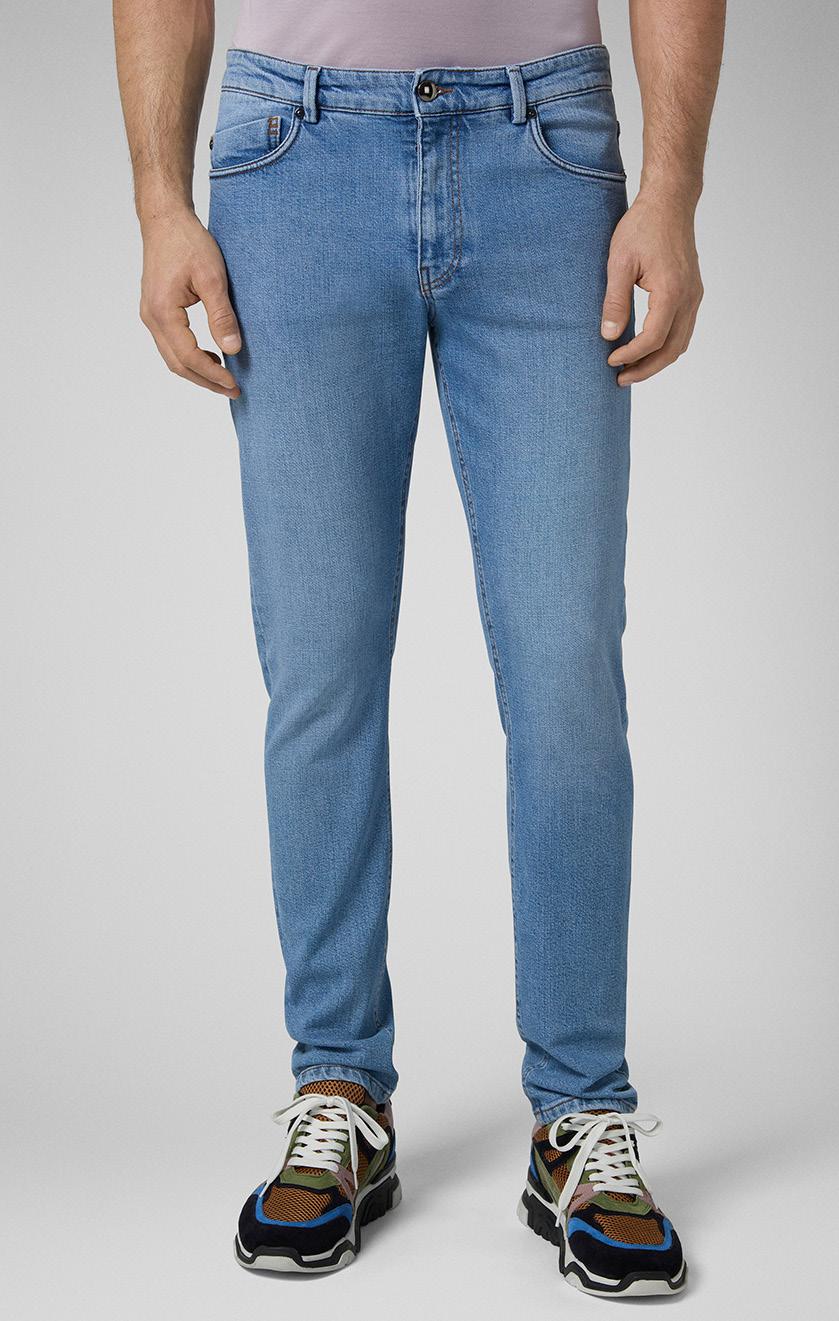 Pantalones jeans de 5 bolsillos elaborada con tela de algodón y lino, ajuste slim fit.