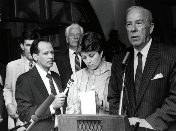 Este representante de la Casa Blanca piso suelo dominicano el 15 de agosto de 1986 para asistir a la juramentación del presidente Joaquín Balaguer, vino en representación del presidente Ronald Reagan. Shultz llegó en un avión del gobierno estadounidense y fue recibido por el embajador norteamericano en el país, Lowell Kilday; Manuel Bergés Chupani, presidente de la Suprema Corte de Justicia; y el secretario de las Fuerzas Armadas, teniente general Manuel Antonio Cuervo Gómez. l