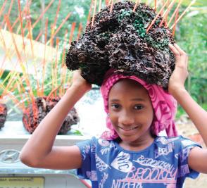 Se utilizan además las hojas de plátanos y guineos, para cubrir parte del cuerpo de los participantes, lo que hace más llamativas las presentaciones.