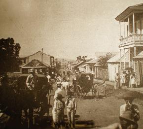 La foto corresponde a la Calle del Sol desde el Parque Colón hacia abajo. A la derecha se ve una casa de dos pisos de madera, que es donde está el Pez Dorado y donde vivió Yoryi Morel, antes de mudarse a la Sánchez, casi frente a la Academia Santiago.