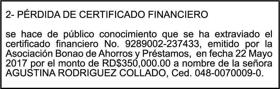 SE hace de público conocimiento la pérdida del Certificado Financiero número 829529502 emitido por Banco Popular Dominicano, S. A. Banco Múltiple, a nombre de AMISAEL ANDELAINE FELIX VICIOSO, portador de la Cédula de Identidad y Electoral número 049-0040467-6, certificado número 829529502 expedido en fecha 6 de febrero de 2022 por el monto de (RD$1,150,000.00) más intereses generados a la fecha.