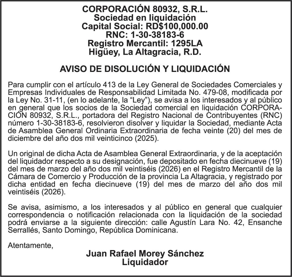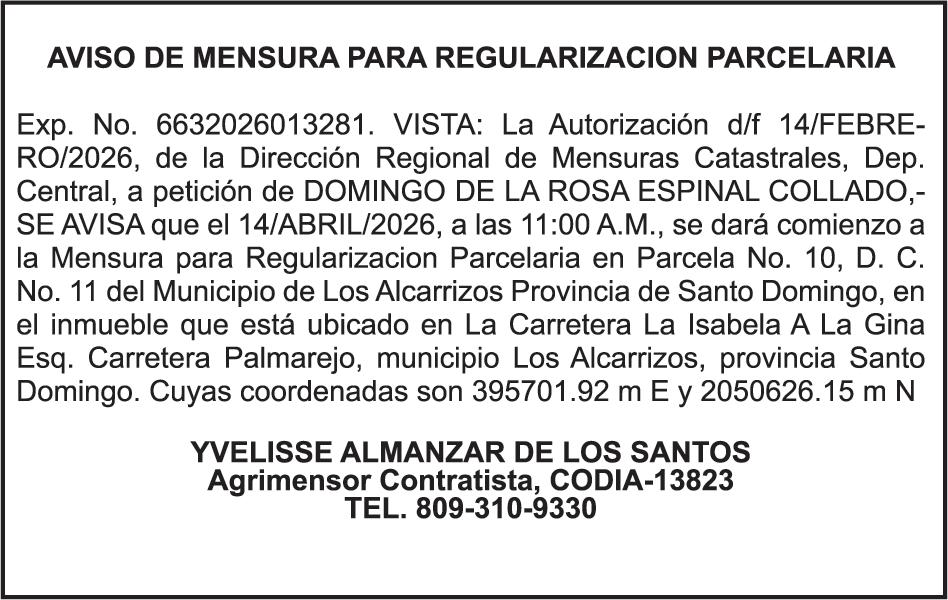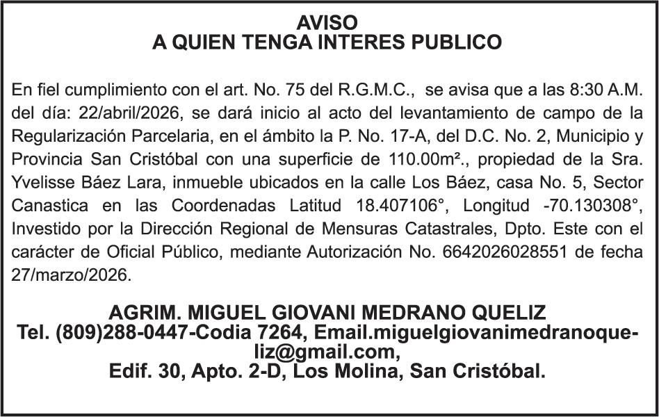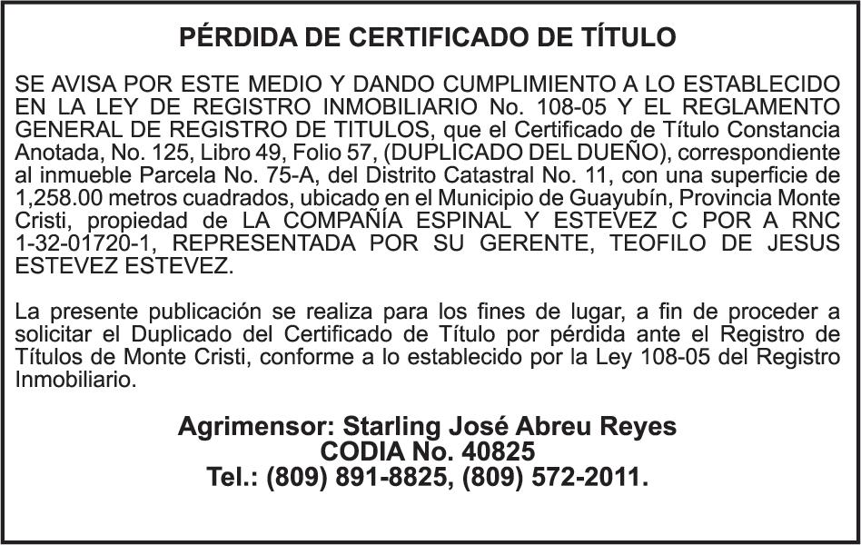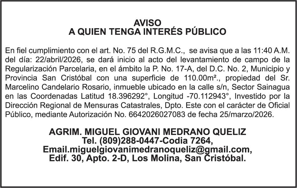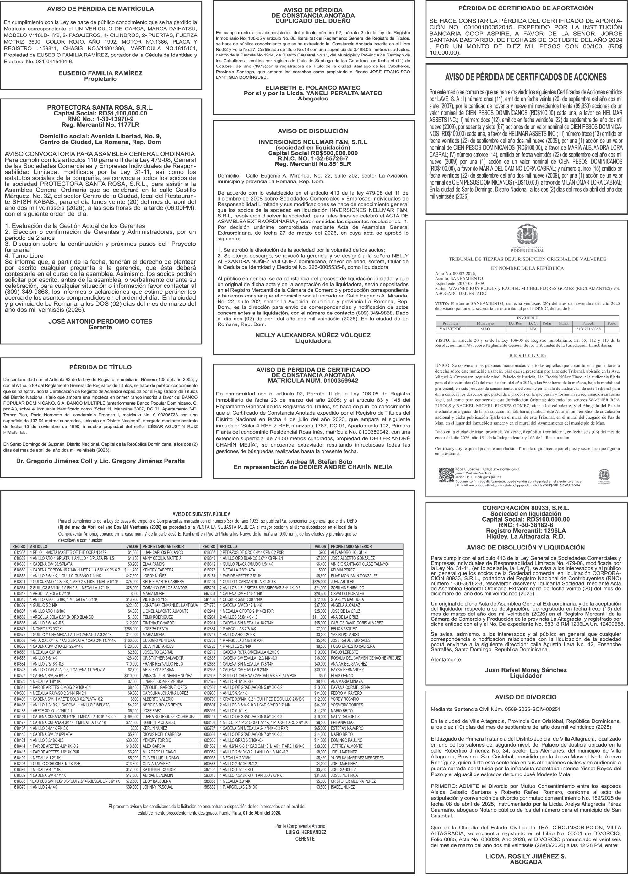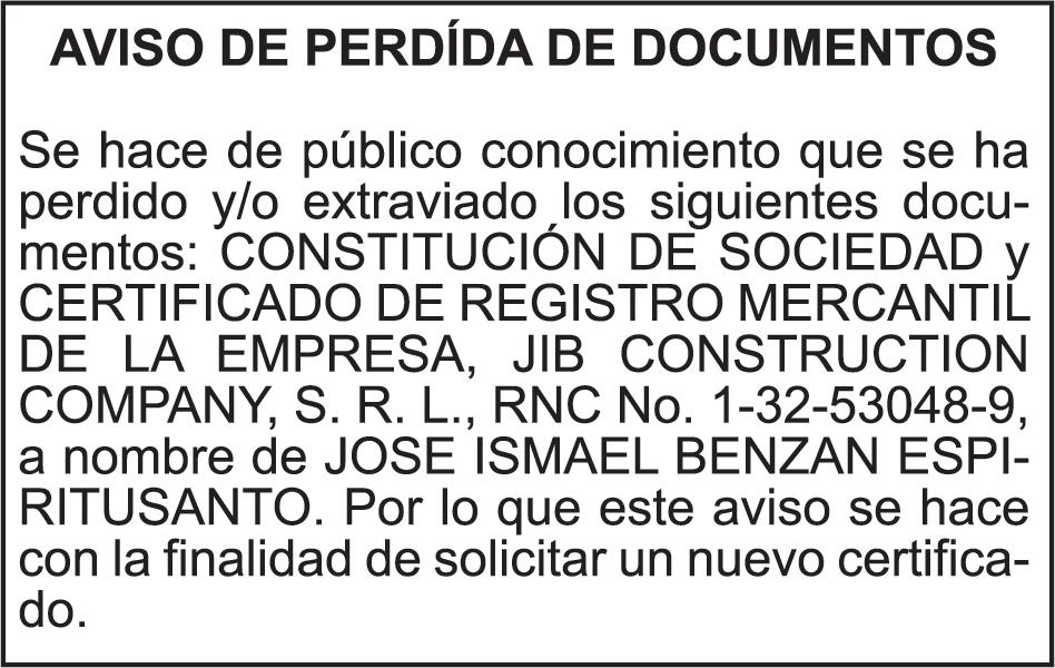 SE hace de público conocimiento la pérdida del Certificado Financiero número 786554030 emitido por Banco Popular Dominicano, S. A. Banco Múltiple, a nombre de MERCEDES FRANCISCA ARREDONDO DE LA ROSA, portadora de la Cédula de Identidad y Electoral número 023-0006831-5, certificad o número 786554030 expedido en fecha 26 de noviembre de 2025 por el monto de (RD$8,430.48) más intereses generados a la fecha.