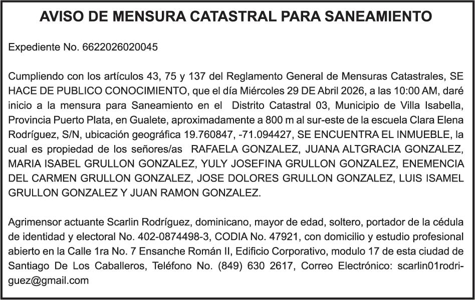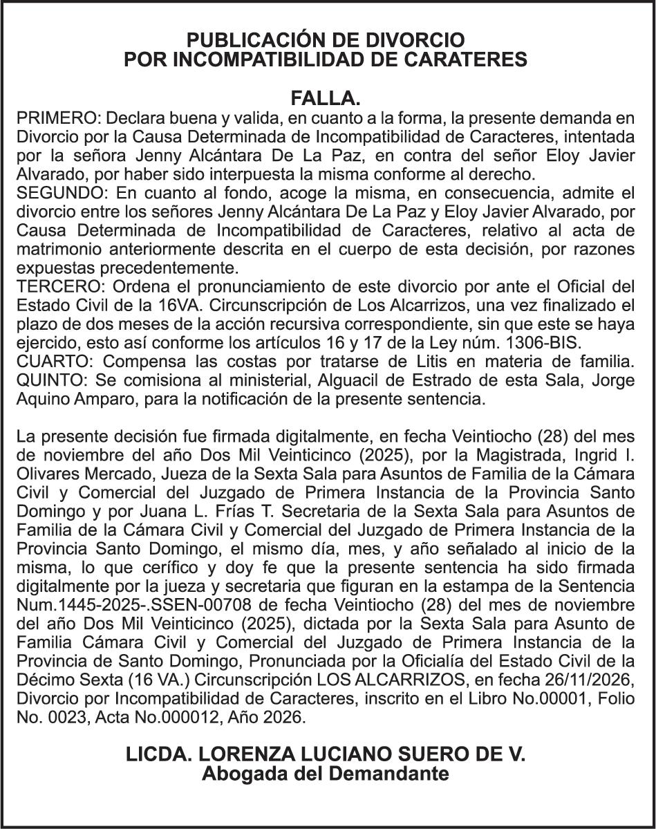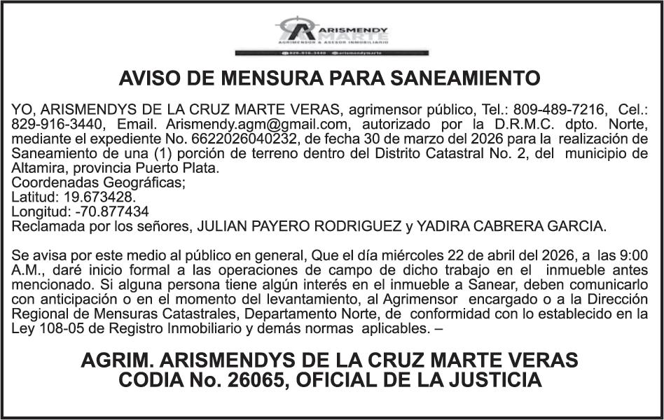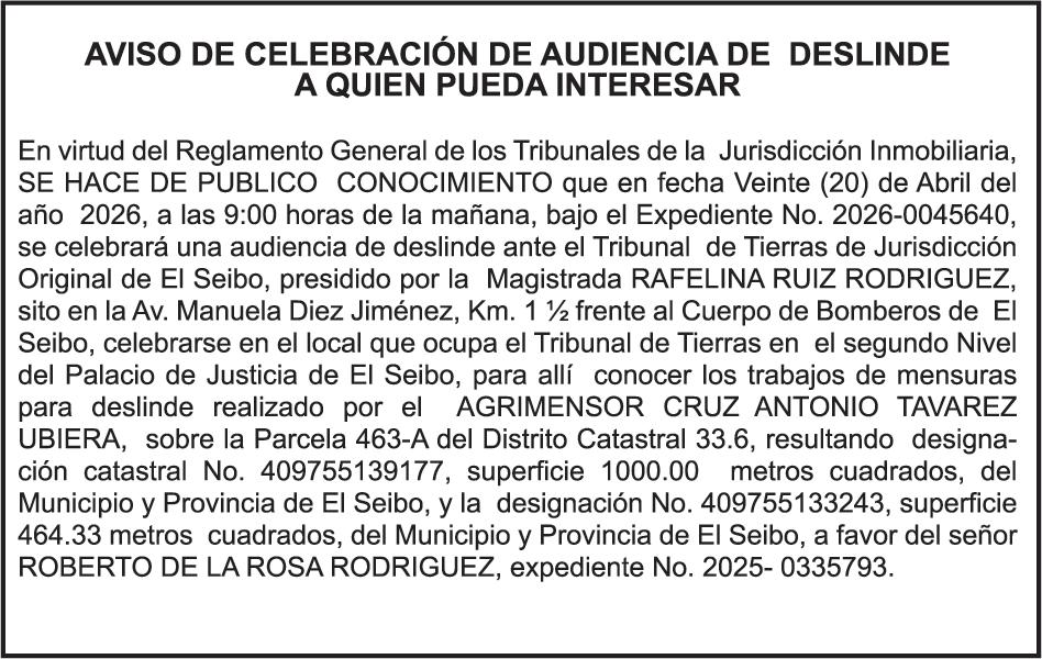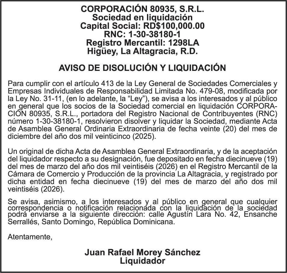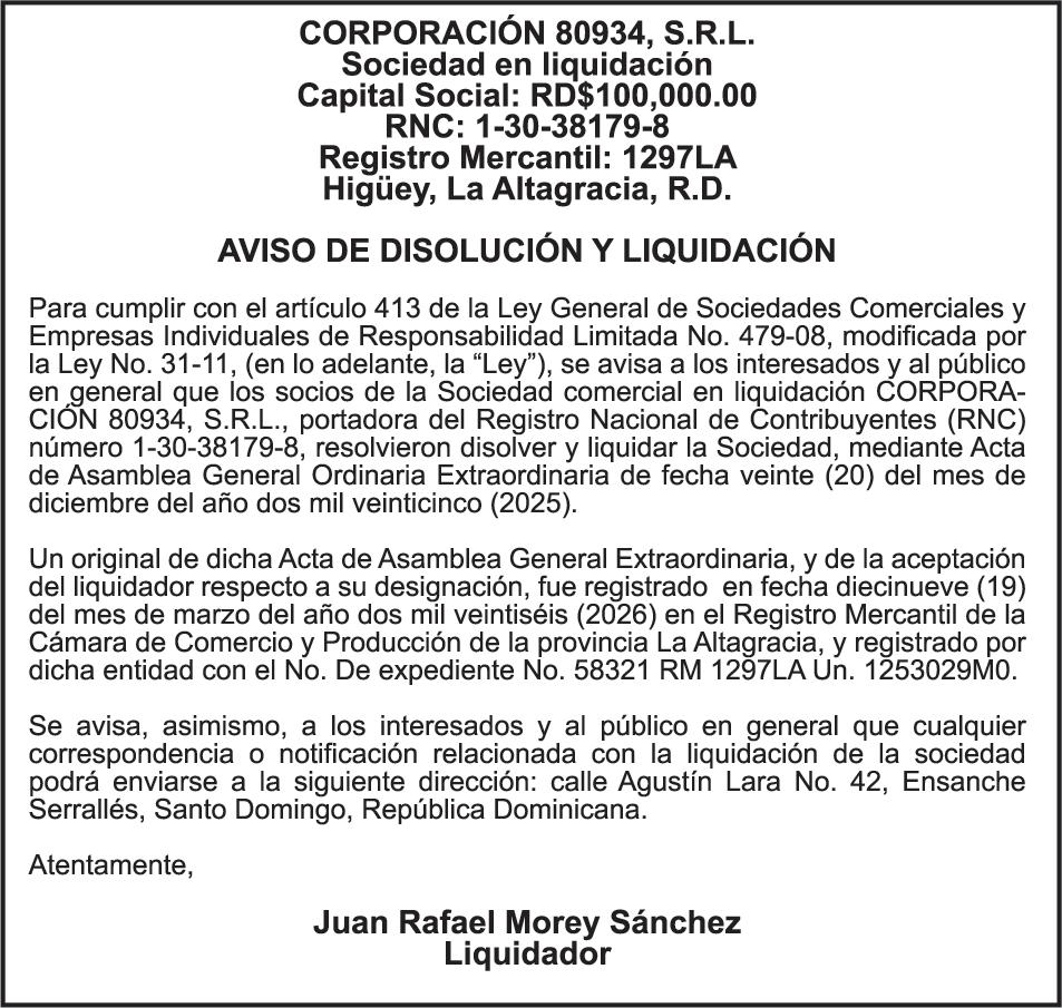 SE hace de público conocimiento la pérdida del Certificado Financiero número 786554030 emitido por Banco Popular Dominicano, S. A. Banco Múltiple, a nombre de MERCEDES FRANCISCA ARREDONDO DE LA ROSA, portadora de la Cédula de Identidad y Electoral número 023-0006831-5, certificad o número 786554030 expedido en fecha 26 de noviembre de 2025 por el monto de (RD$8,430.48) más intereses generados a la fecha.