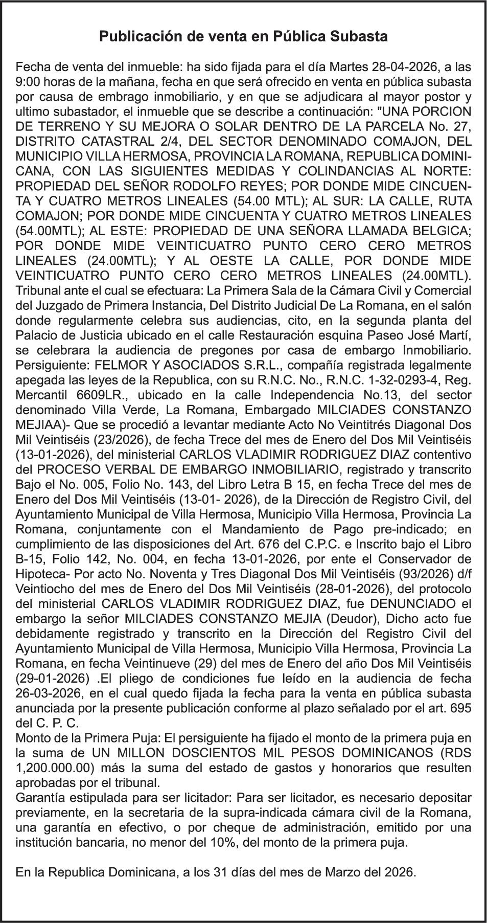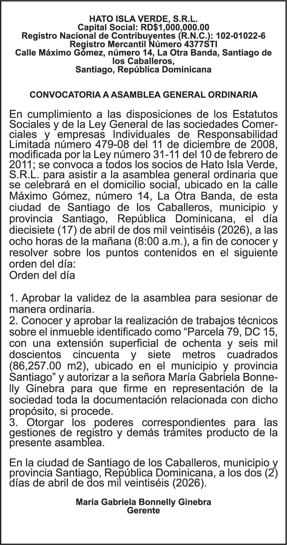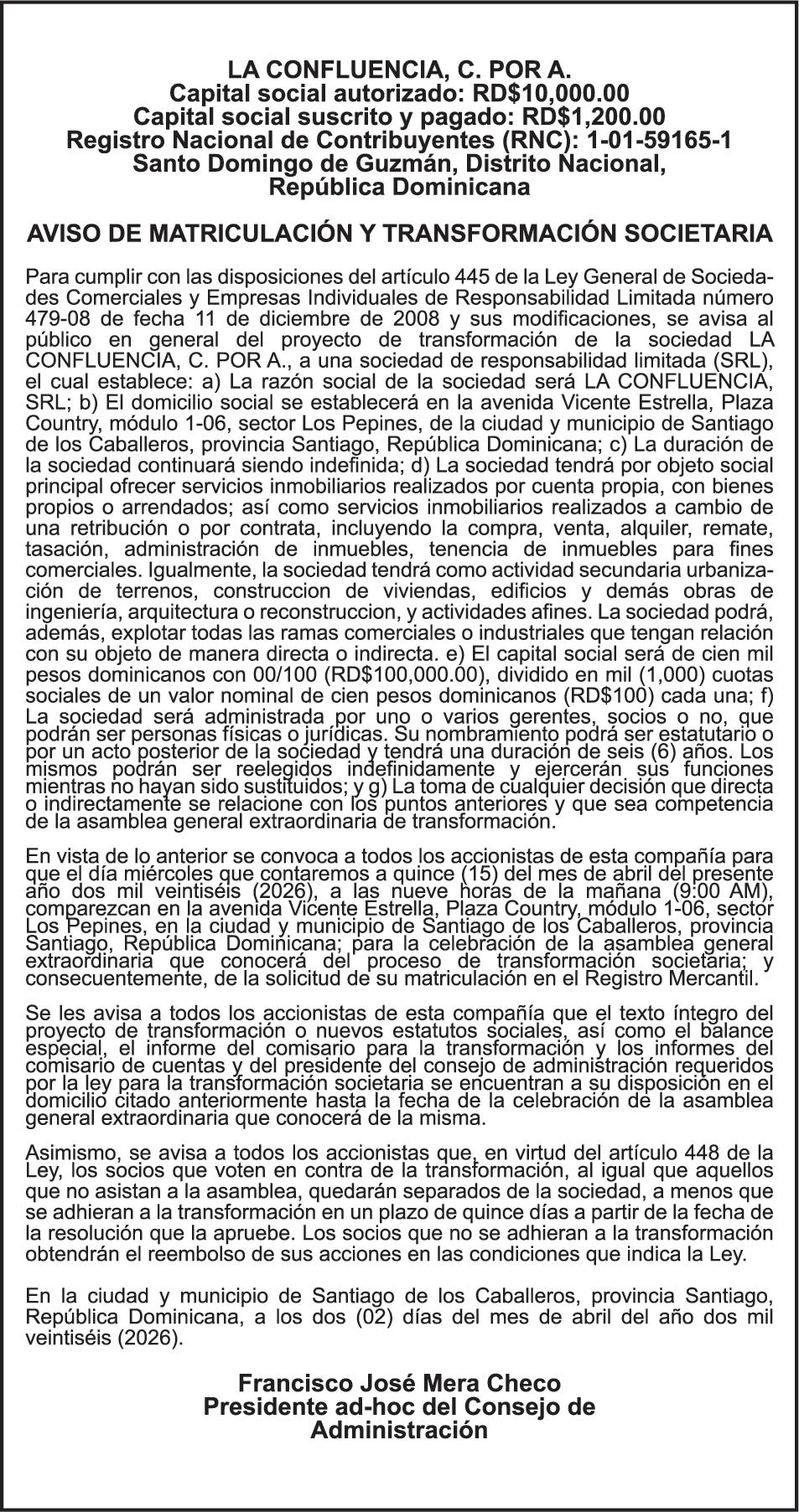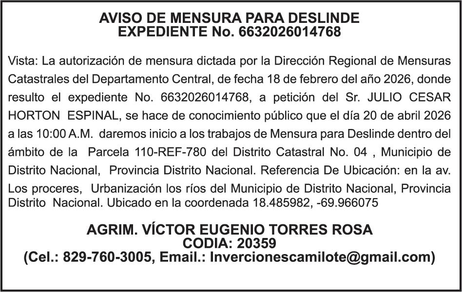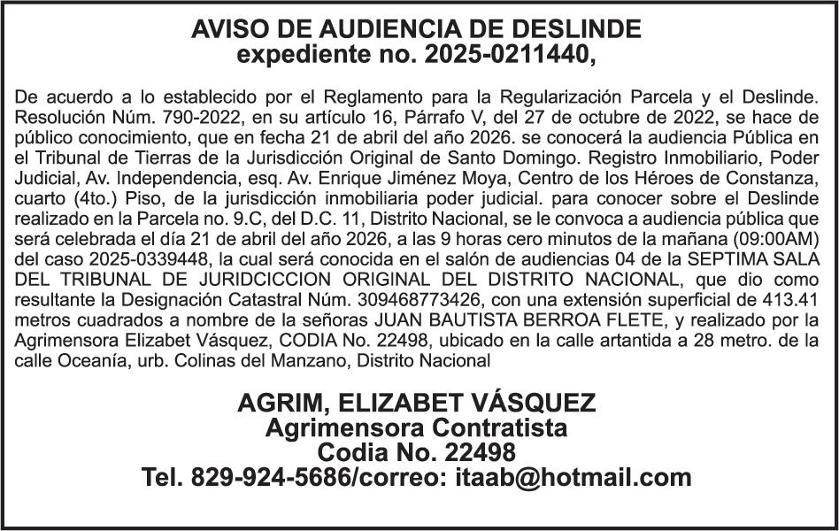 SE hace de público conocimiento la pérdida del Certificado Financiero número 786554030 emitido por Banco Popular Dominicano, S. A. Banco Múltiple, a nombre de MERCEDES FRANCISCA ARREDONDO DE LA ROSA, portadora de la Cédula de Identidad y Electoral número 023-0006831-5, certificad o número 786554030 expedido en fecha 26 de noviembre de 2025 por el monto de (RD$8,430.48) más intereses generados a la fecha.
