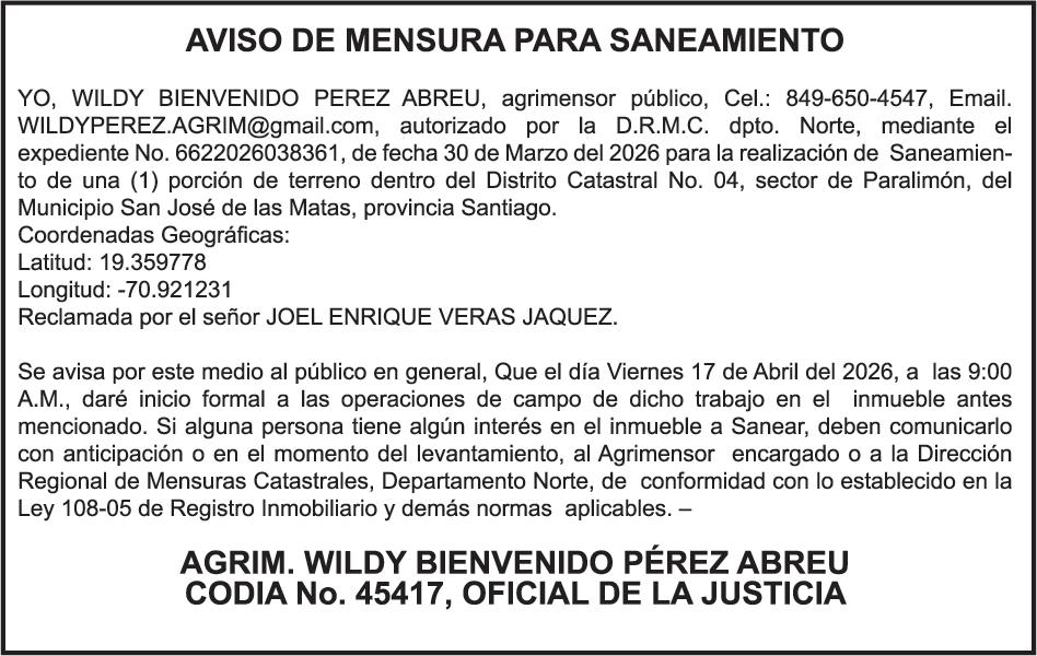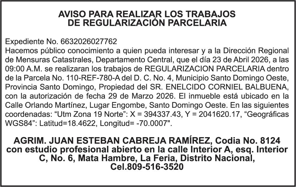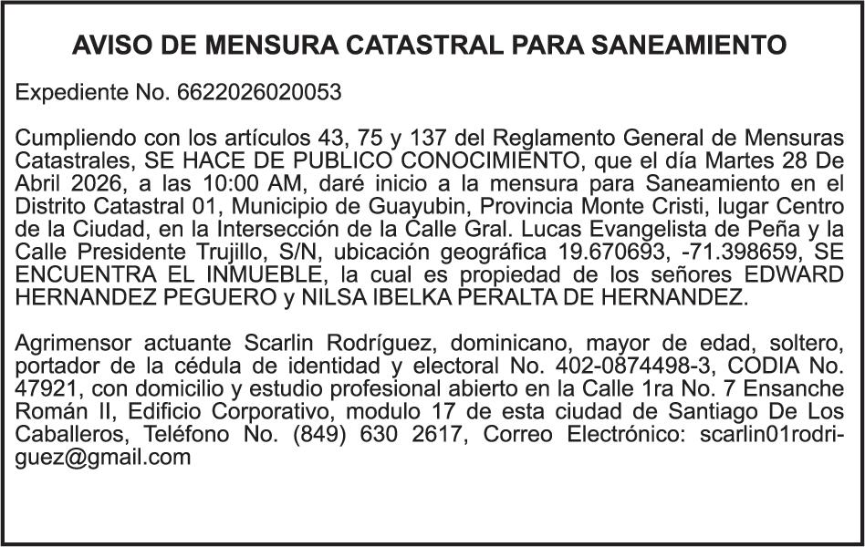 SE hace de público conocimiento la pérdida del Certificado Financiero número 848036166 emitido por Banco Popular Dominicano, S. A. Banco Múltiple, a nombre de WILFREDO HIDALGO UREÑA, portador de la Cédula de Identidad y Electoral número 001-0505604-8 certificado número 848036166 expedido el 21 de marzo de 2025 por el monto de (USD$22,262.38) más intereses generados a la fecha.