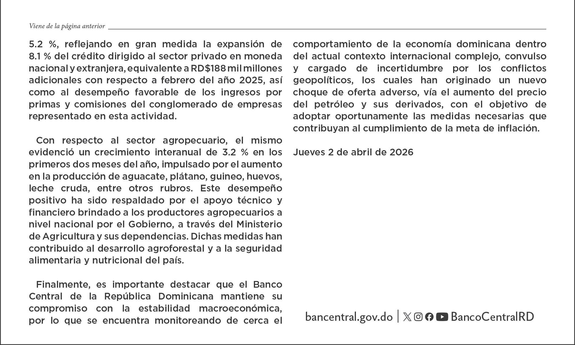 BANCO CENTRAL P.19 ECONOMÍA DE RD CRECE 3.9 % EN MES DE FEBRERO RD N RO