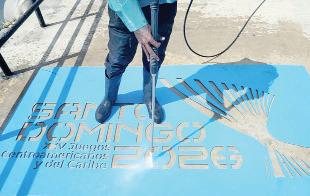 AMBIENTE. El Comité Organizador de los Juegos Centroamericanos y del Caribe Santo Domingo 2026 lleva a cabo una campaña promocional en diferentes puntos de la capital utilizando un sistema conocido como “grafitti” inverso, que consiste en limpiar parte de las acera con agua a presión.