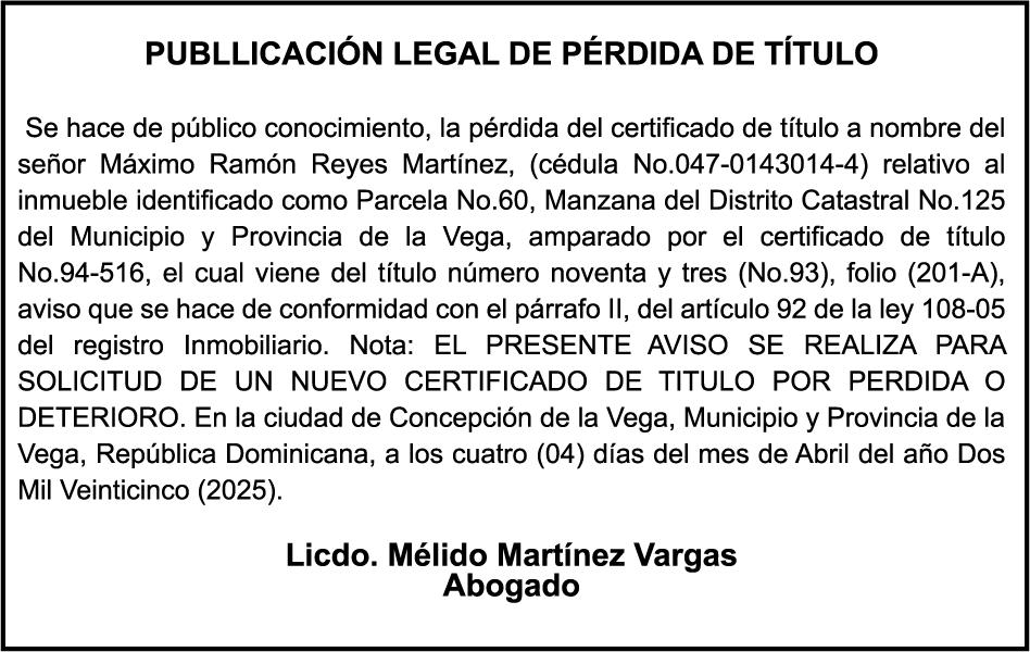 SE hace de público conocimiento la pérdida del Certificado Financiero número 846353274 emitido por Banco Popular Dominicano, S. A. Banco Múltiple, a nombre de WILLIAN MARTE, portador de la Cédula de Identidad y Electoral número 001-1123018-1, certificado número 846353274 expedido en fecha 7 de enero de 2025 por el monto de (RD$202,723.19) más intereses generados a la fecha.