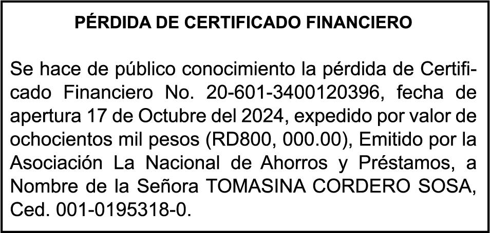 SE hace de público conocimiento la pérdida del Certificado Financiero número 835504838 emitido por Banco Popular Dominicano, S. A. Banco Múltiple, a nombre de ENSLY GRISELL GUILAMO CEBALLOS DE CASTILLO, portadora de la Cédula de Identidad y Electoral número 223-0039977-5, certificado número 835504838 expedido en fecha 10 de agosto de 2023 por el monto de (US$5,421.24) más intereses generados a la fecha.