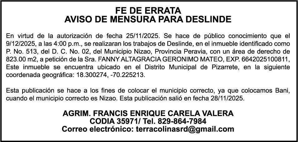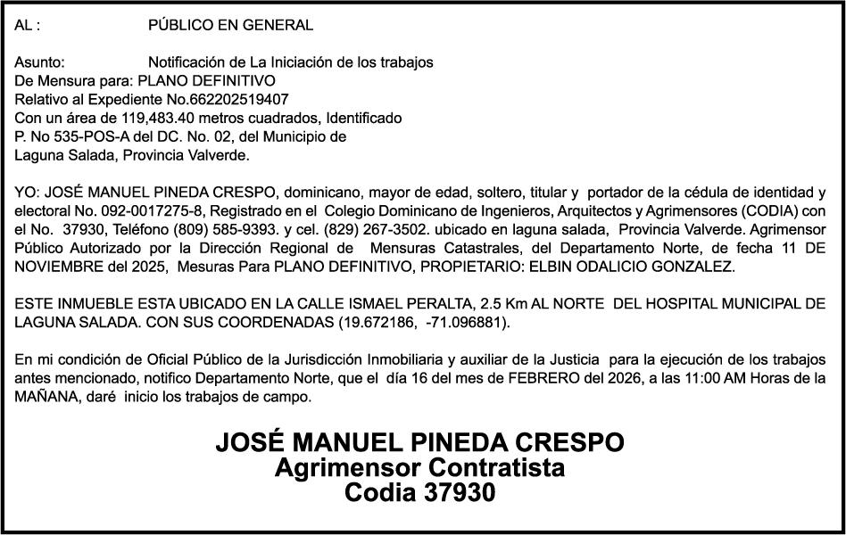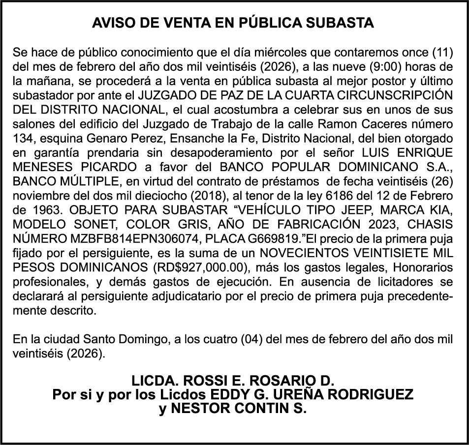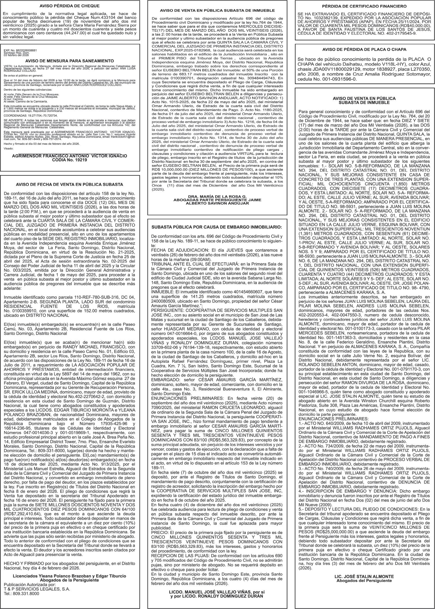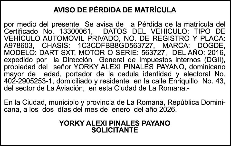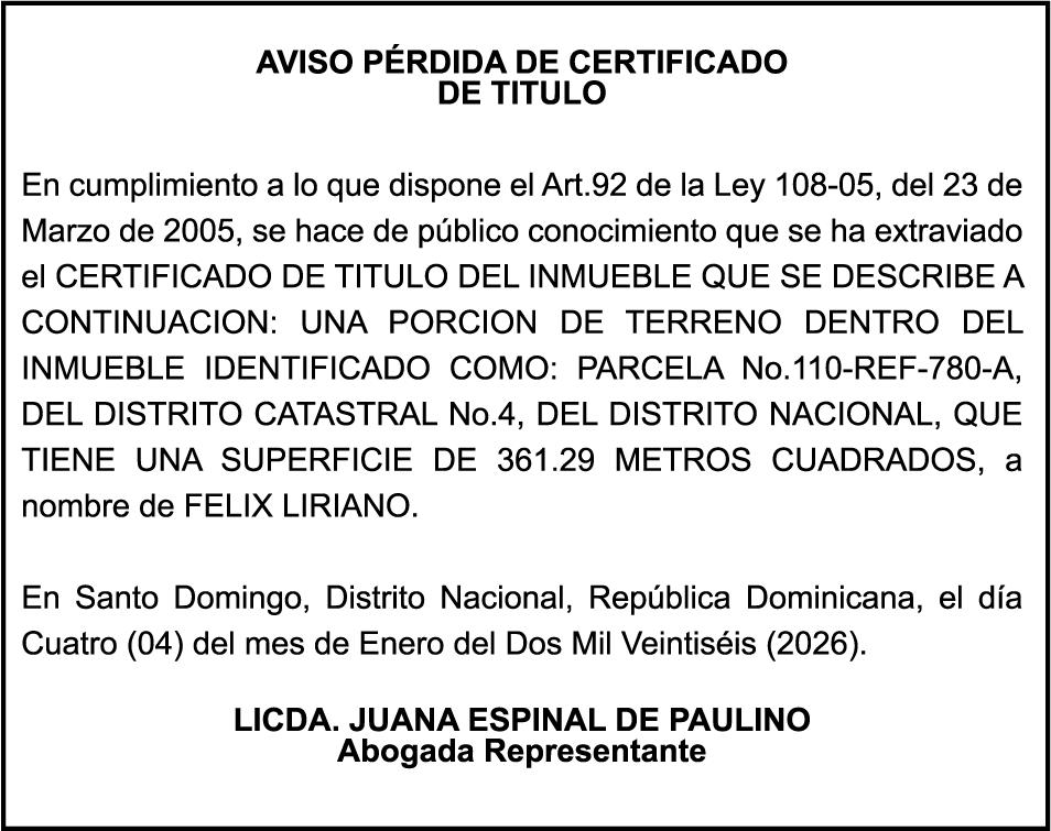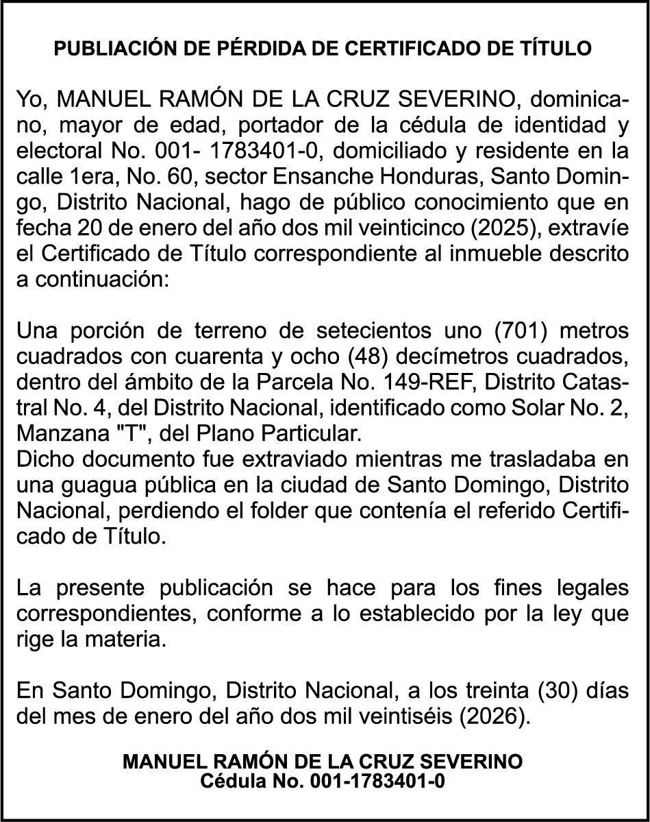 SE hace de público conocimiento la pérdida del Certificado Financiero número 847164191 emitido por Banco Popular Dominicano, S. A. Banco Múltiple, a nombre de CRISTIN YLIANA DE PAULA, portadora de la Cédula de Identidad y Electoral número 023-0169065-3, certificado número 847164191 expedido en fecha 11 de febrero de 2025 por el monto de (RD$125,803.99) más intereses generados a la fecha.