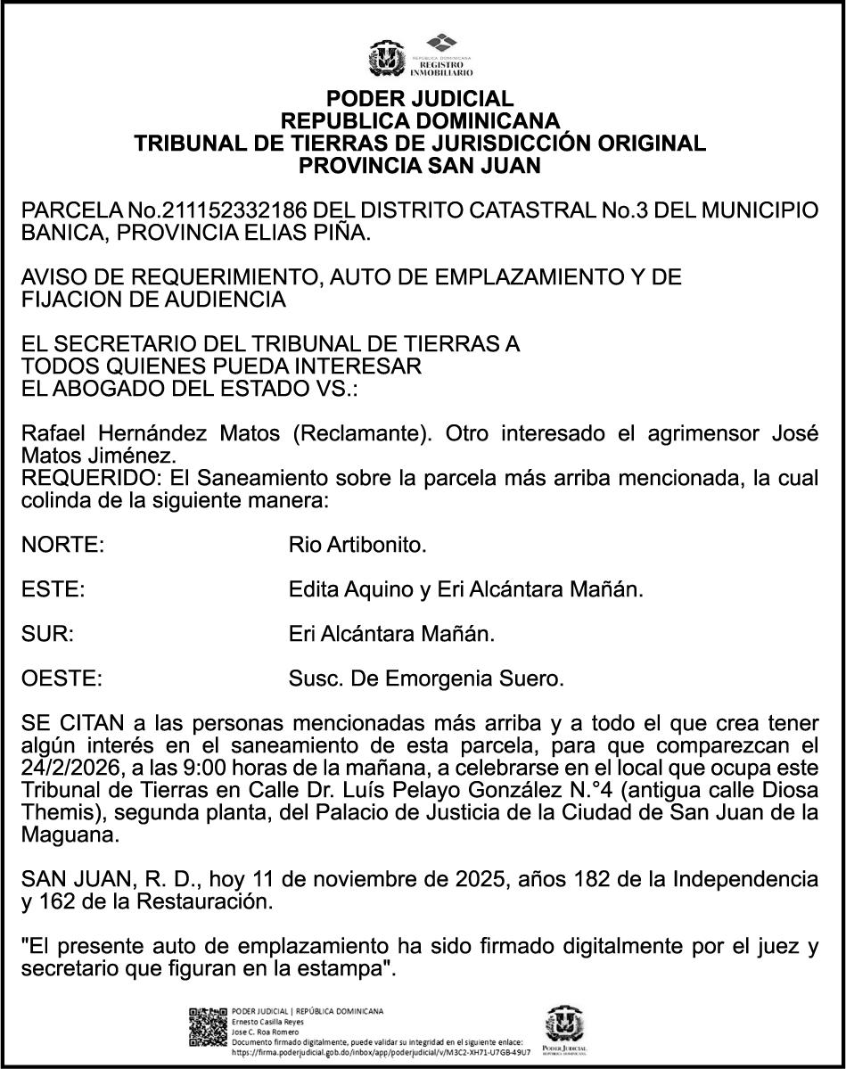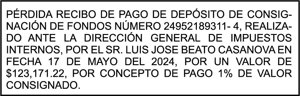SE hace de público conocimiento la pérdida del Certificado Financiero número 839171675 emitido por Banco Popular Dominicano, S. A. Banco Múltiple, a nombre de MARIA ANTONIA FERNANDEZ DE LA CRUZ, portadora de la Cédula de Identidad y Electoral número 049-0057745-5, certificado número 839171675 expedido en fecha 8 de febrero de 2024 por el monto de (RD$500,000.00) más intereses generados a la fecha.