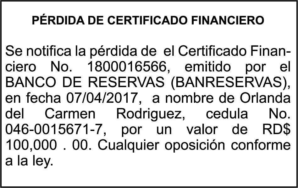 SE hace de público conocimiento la pérdida del Certificado Financiero número 766655138 emitido por Banco Popular Dominicano, S. A. Banco Múltiple, a nombre de FRANCISCO FELIZ SUERO, portador de la Cédula de Identidad y Electoral número 001-1347505-7, certificado número 766655138 expedido el 27 de abril de 2011 por el monto de (RD$86,680.36) más intereses generados a la fecha.